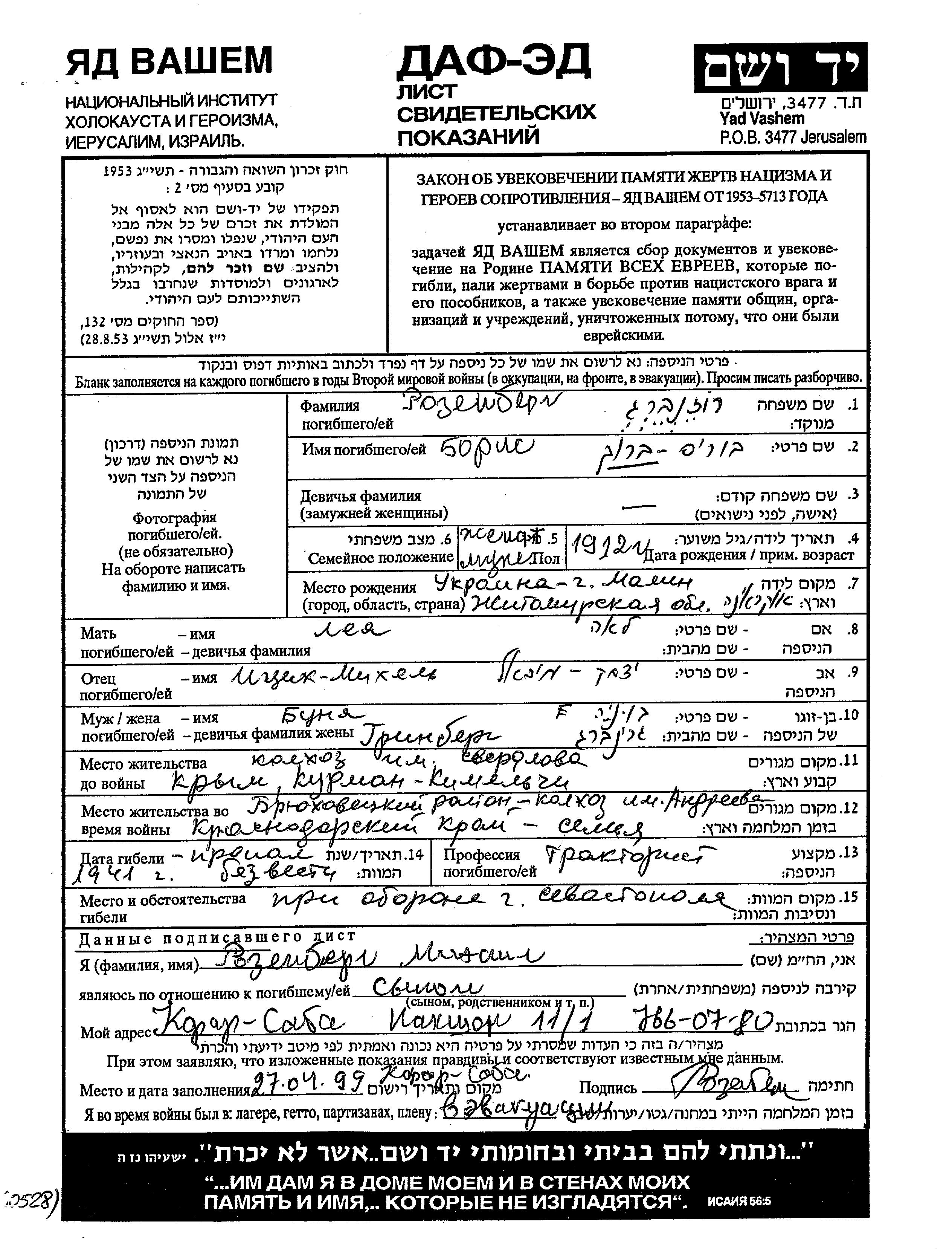 ברוך בוריס רוזנברג נולד בMalin שבאוקראינה (ברה"מ) בשנת 1912 ליצחק מיכאל ולאה. הוא היה נהג טרקטור ונשוי לBunya לבית גרינברג. לפני מלחמת העולם השניה התגורר בKurman Kemelchi שברוסיה (ברה"מ). בזמן המלחמה הוא היה בBryukhovetskaya שברוסיה (ברה"מ). ברוך בוריס נרצח בשואה. מקום המוות: Sevastopol שברוסיה (ברה"מ) בשנת 1941.