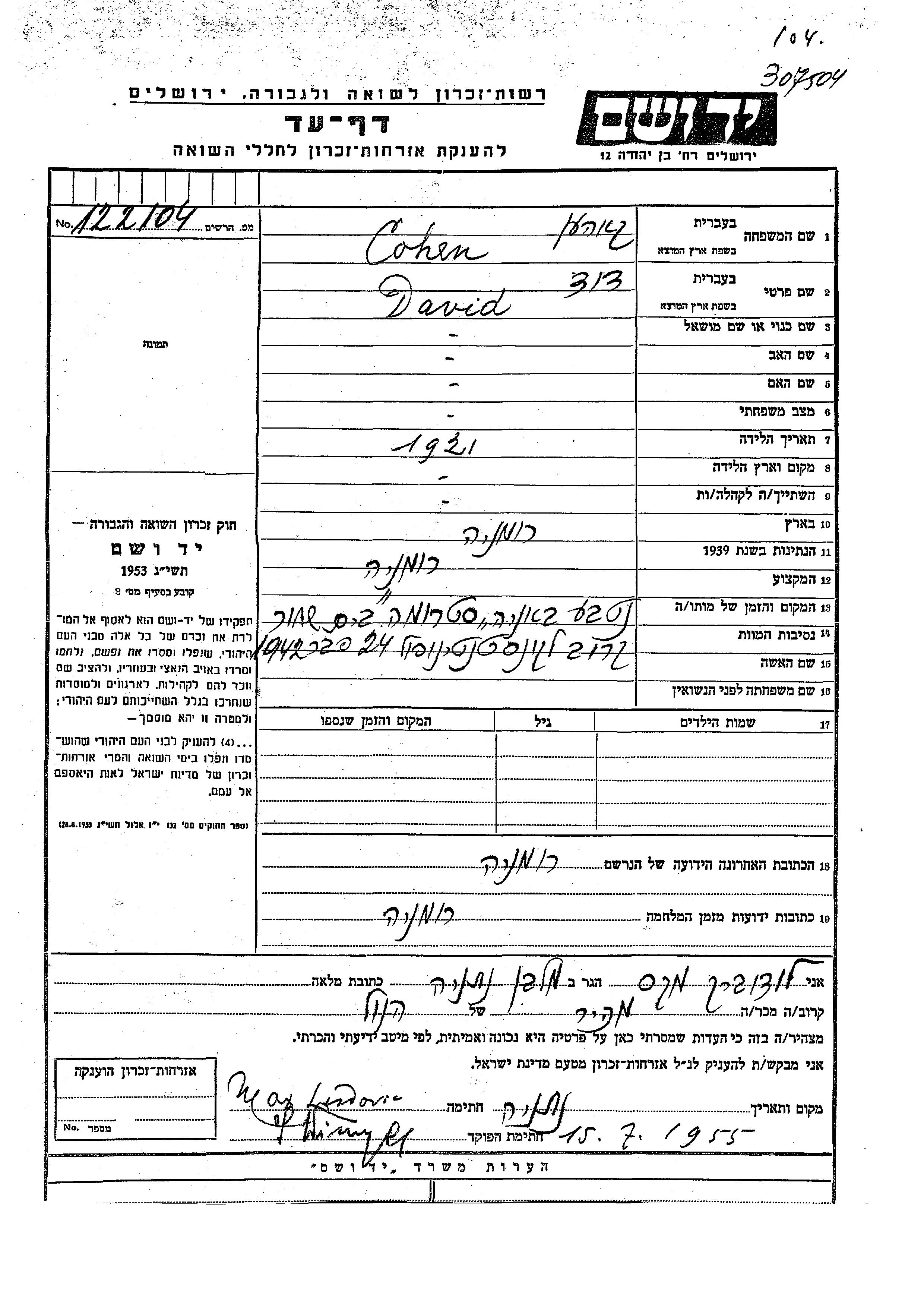 דוד Choen נולד בשנת 1921. לפני מלחמת העולם השניה התגורר ברומניה. בזמן המלחמה הוא היה ברומניה.