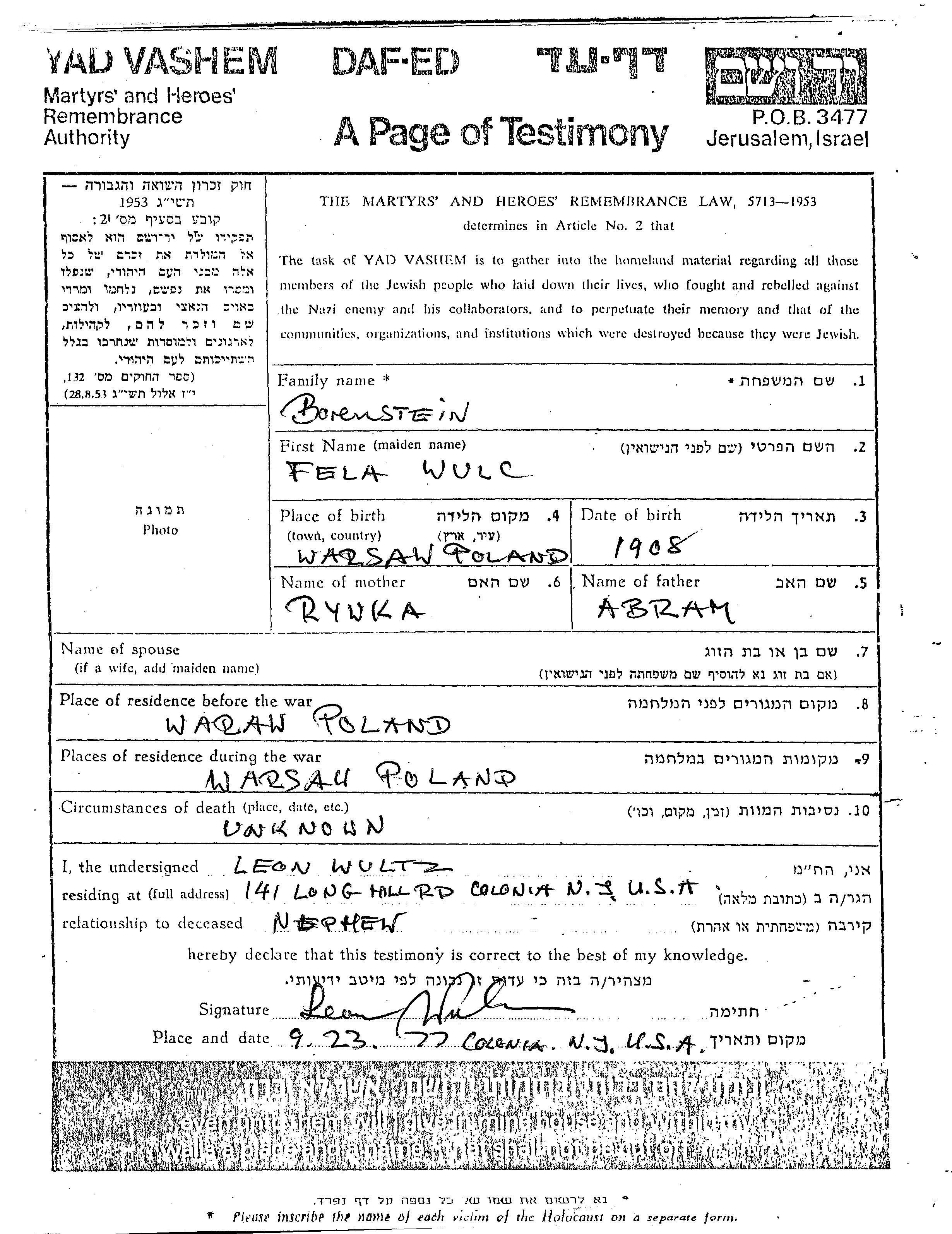 Fela Borenstein לבית Wulc נולדה בWarsaw שבפולין בשנת 1908 לAbram וRywka. היא היתה עקרת בית. לפני מלחמת העולם השניה התגוררה בWarsaw שבפולין. בזמן המלחמה היא היתה בWarsaw שבפולין.