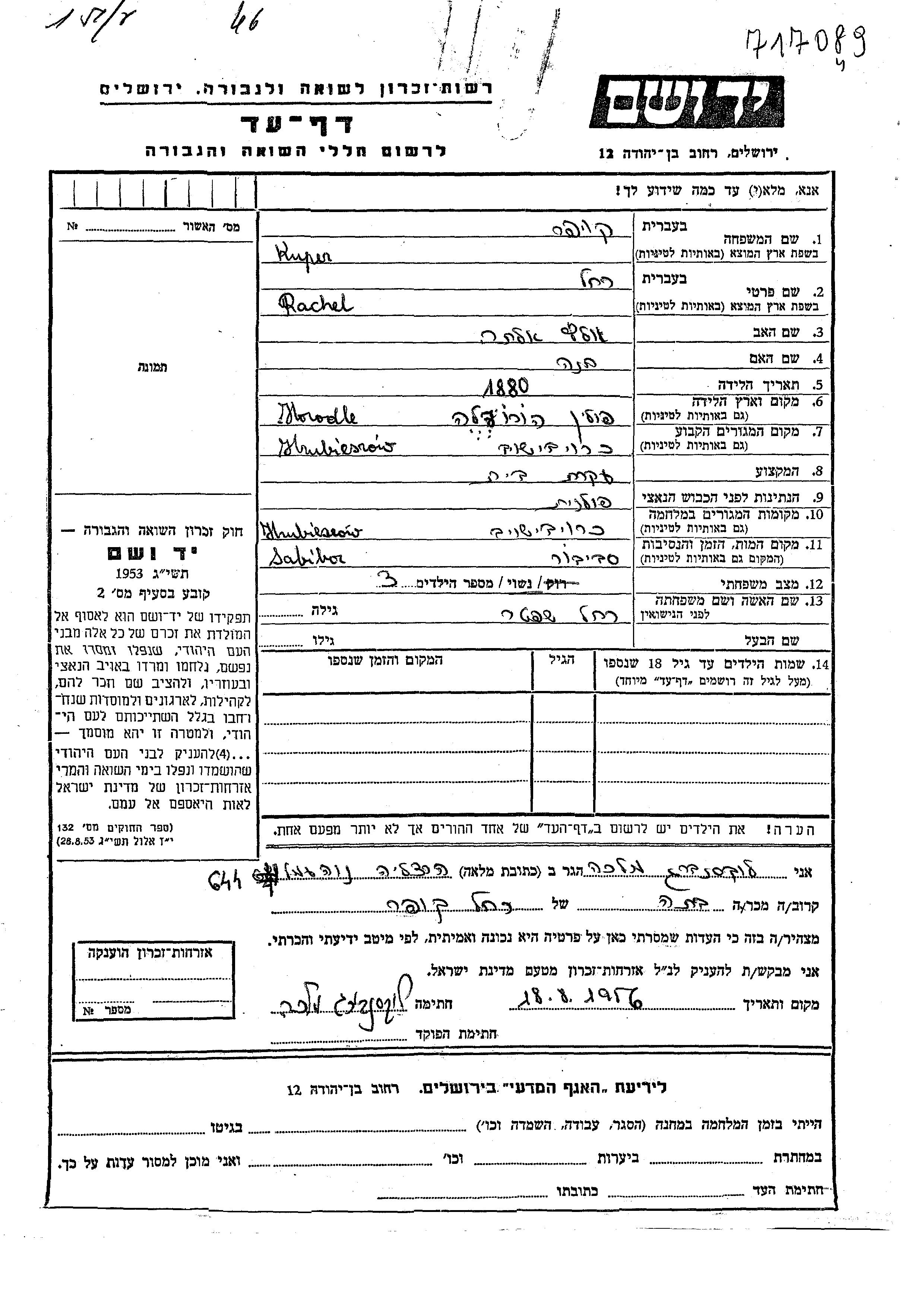 קופר רחל 1880 Hrubieszow, פולין דף-עד