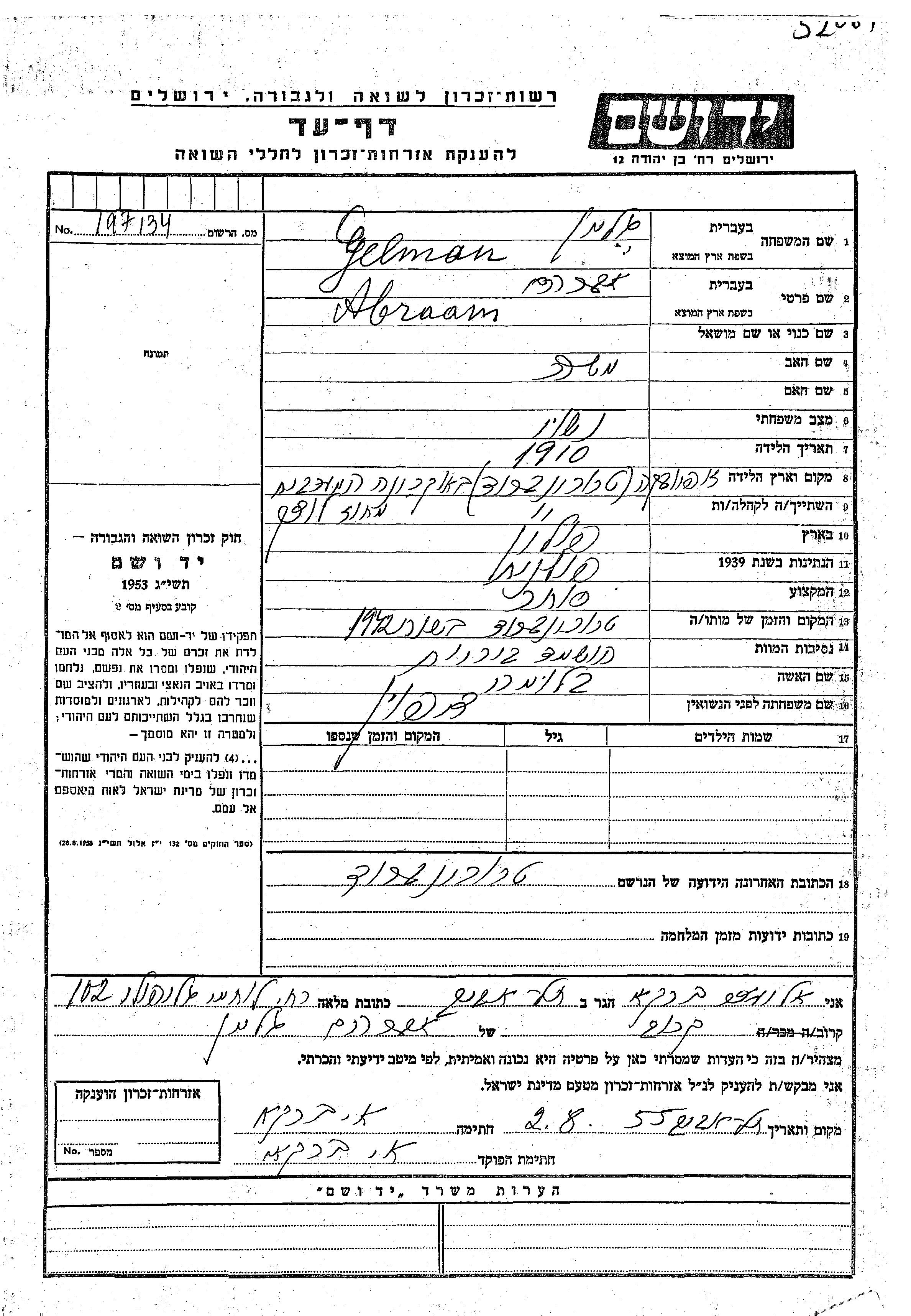 Abraam גלמן נולד בZofjówka שבפולין בשנת 1910 למשה. הוא היה סוחר ונשוי לבלומה לבית דיפון. לפני מלחמת העולם השניה התגורר בTrochenbrod שבפולין. בזמן המלחמה הוא היה בTrochenbrod שבפולין. הוא נרצח בשואה. מקום המוות: Trochenbrod שבפולין בשנת 1942.