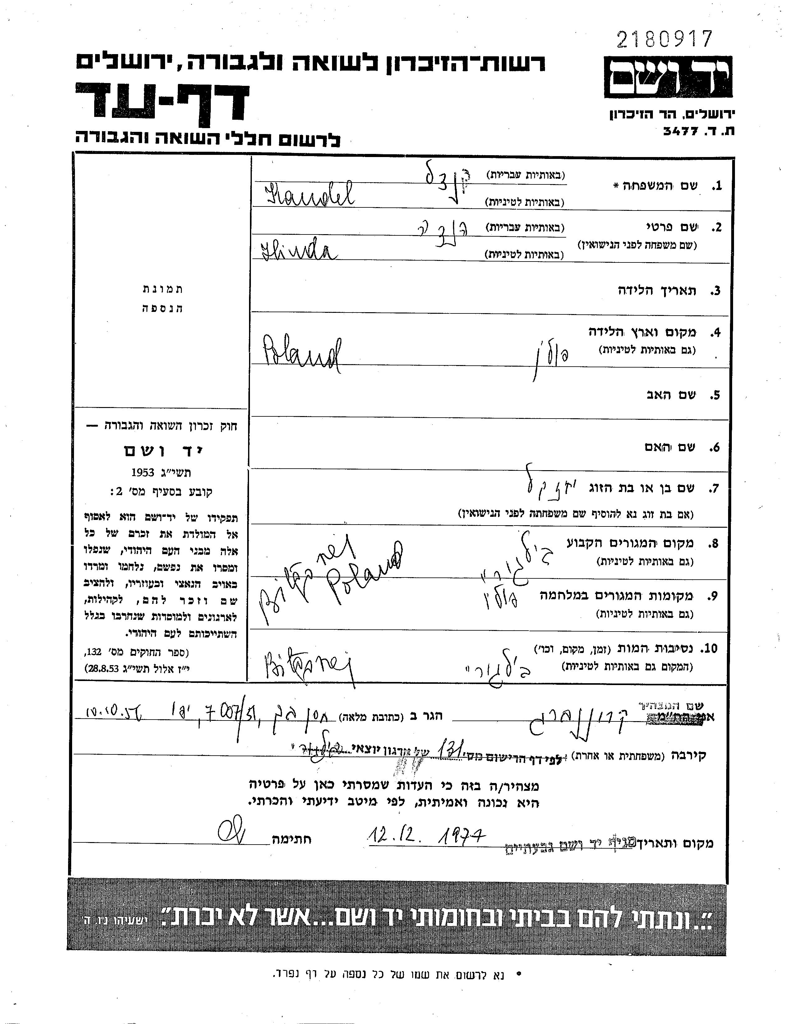 | קנדל | הינדא | 1890 | Bilgoraj, פולין | רשימת קורבנות מתועדים בתיקי חס"א |