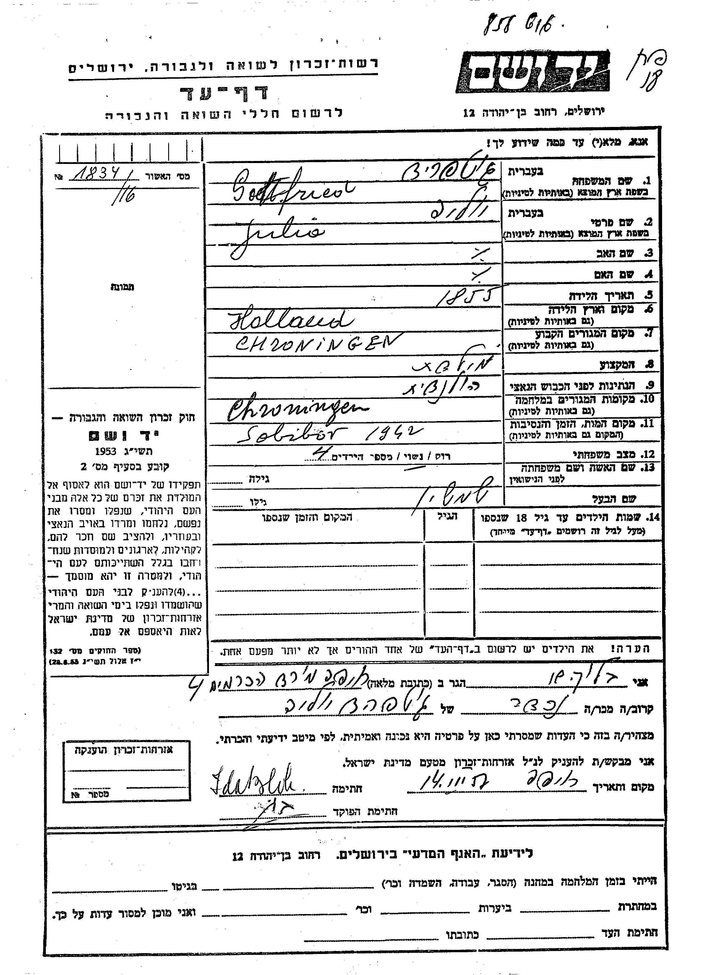 היא נרצחה בשואה. מקום המוות: Sobibor שבפולין בשנת 1942.