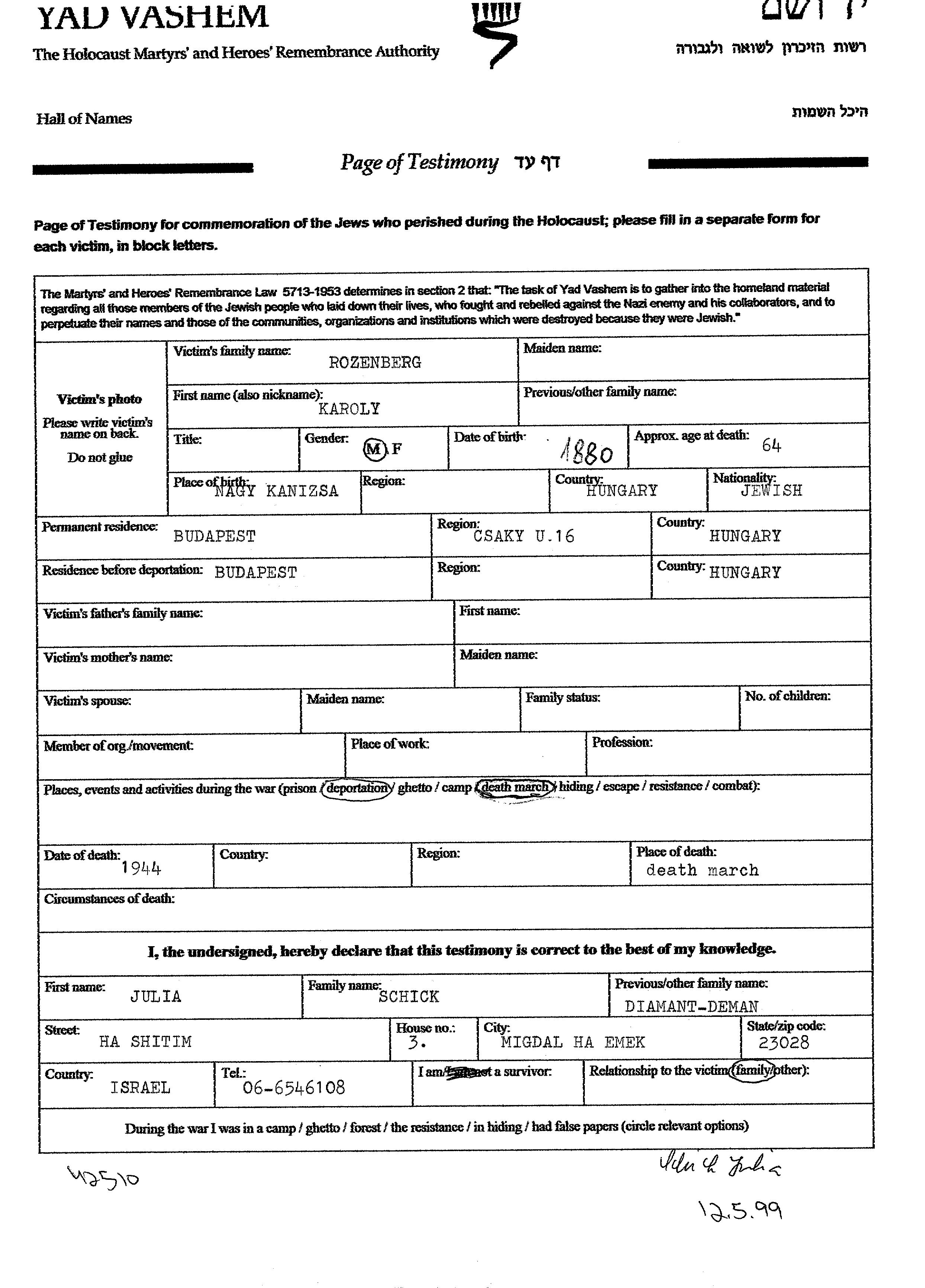 Karoly רוזנברג נולד בNagy Kanizsa שבהונגריה בשנת 1880. לפני מלחמת העולם השניה התגורר בBudapest שבהונגריה. בזמן המלחמה הוא היה בBudapest שבהונגריה. הוא נרצח בשואה. מקום המוות: לא ידוע בשנת 1944.