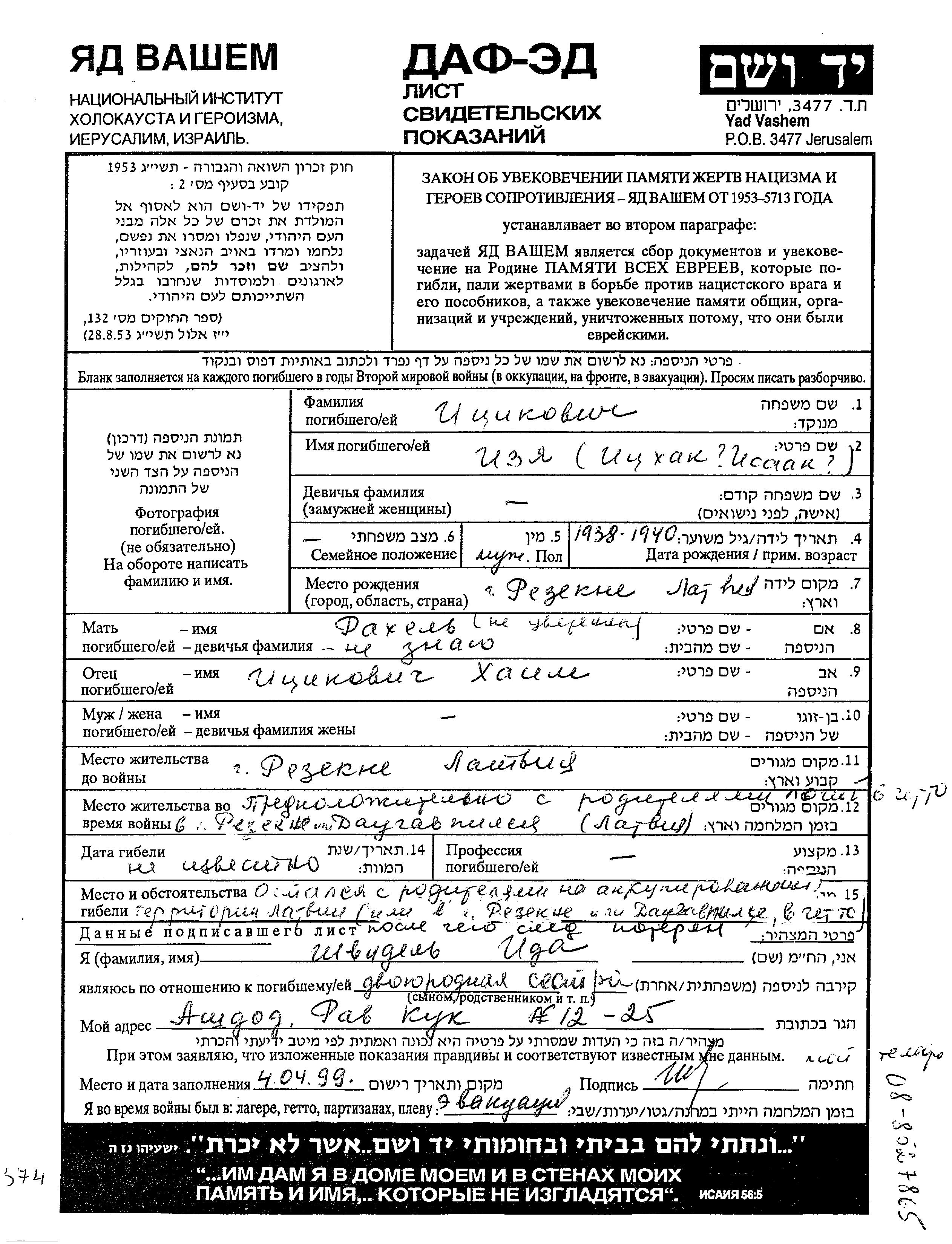 Izya יצחק Itzikovich נולד בRēzekne שבלטביה בשנת 1938 לחיים ורחל. הוא היה רווק. לפני מלחמת העולם השניה התגורר בRēzekne שבלטביה. בזמן המלחמה הוא היה בRēzekne שבלטביה.