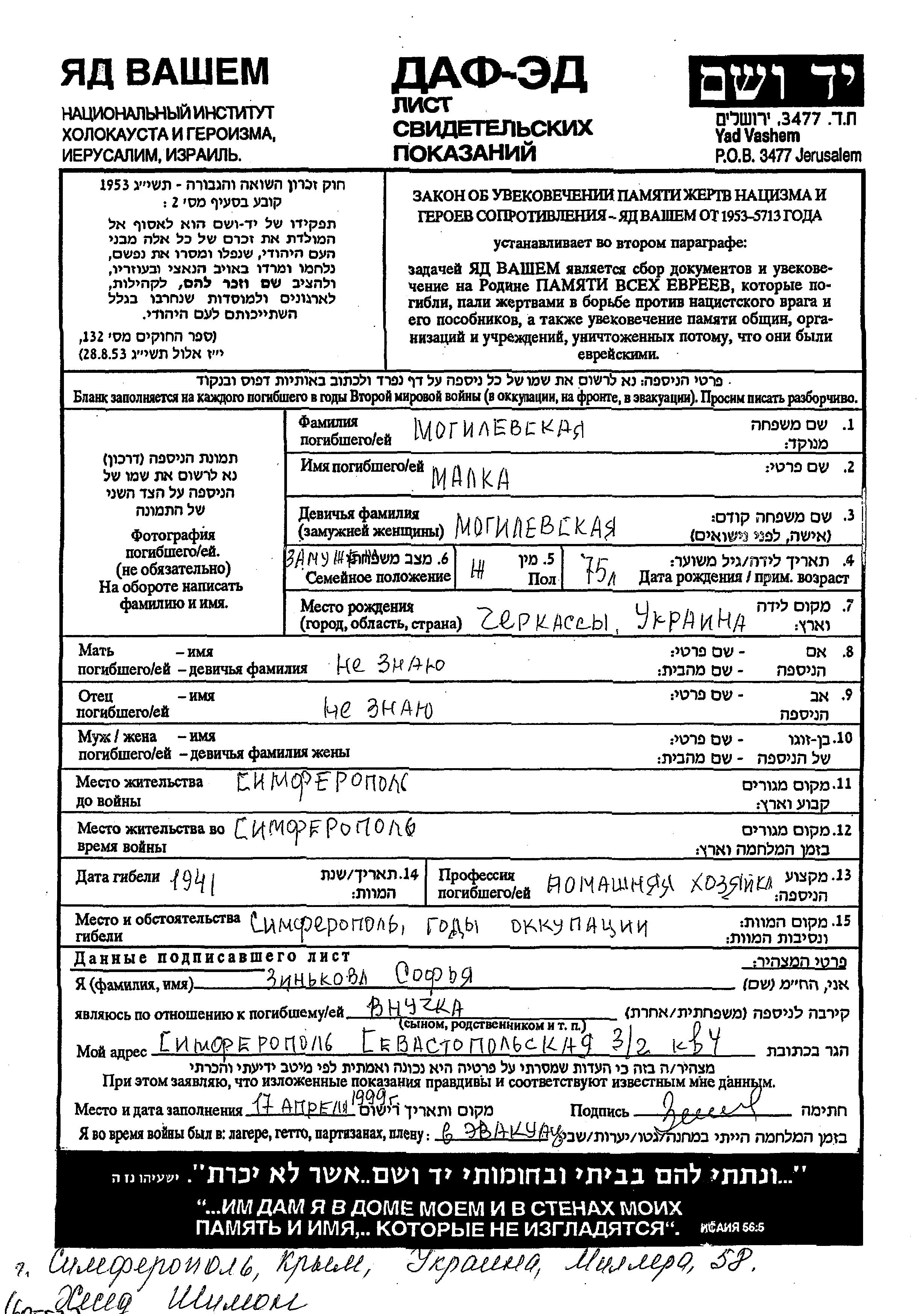 מלכה Mogilevskaya נולדה בCherkassy שבאוקראינה (ברה"מ). היא היתה עקרת בית ונשואה. לפני מלחמת העולם השניה התגוררה בSimferopol שברוסיה (ברה"מ). בזמן המלחמה היא היתה בSimferopol שברוסיה (ברה"מ). מלכה נרצחה בשואה. מקום המוות: Simferopol שברוסיה (ברה"מ) בשנת 1941.