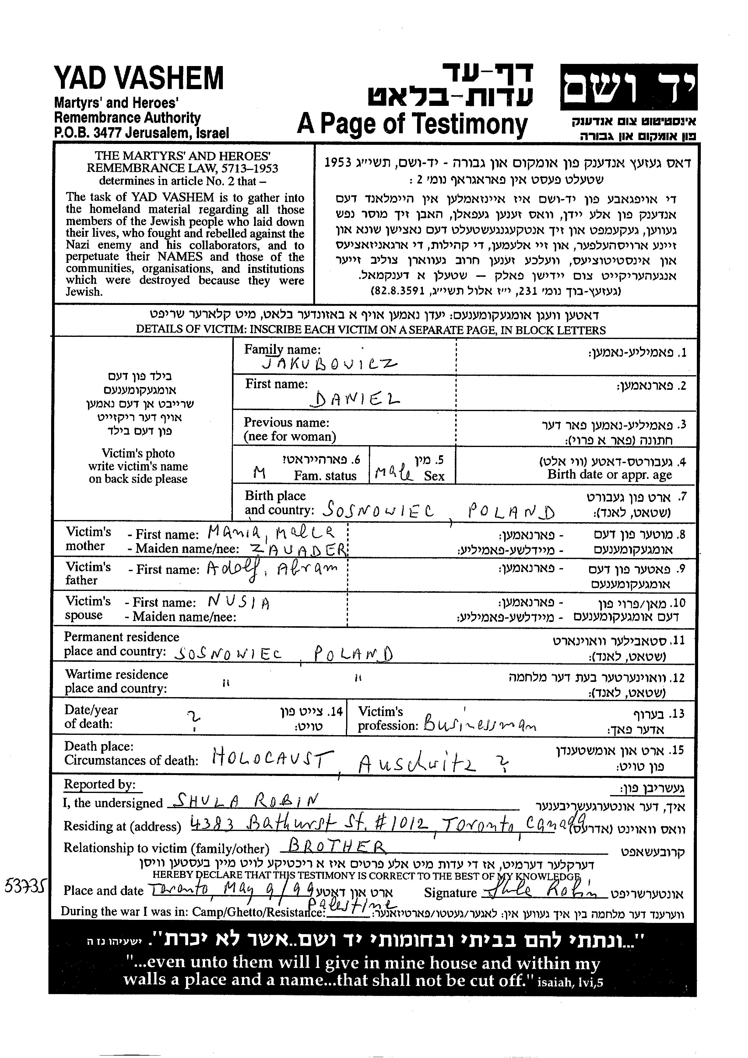 דניאל Jakubovicz נולד בSosnowiec שבפולין לאברם אדולף ומניה Malca. הוא היה איש עסקים ונשוי לנושיה. לפני מלחמת העולם השניה התגורר בSosnowiec שבפולין. בזמן המלחמה הוא היה בSosnowiec שבפולין.