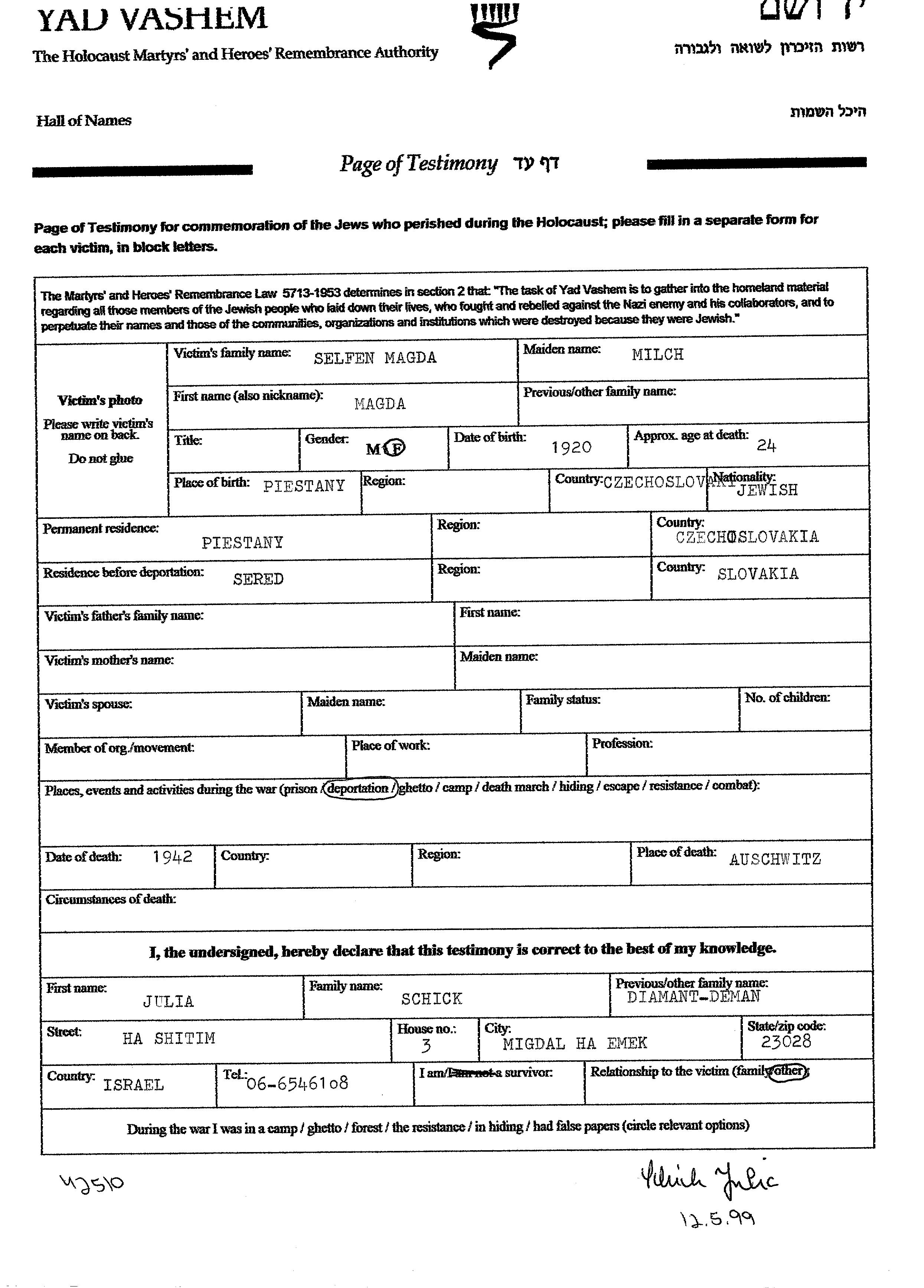מגדה Selfen לבית Milch נולדה בPiestany שבצ'כוסלובקיה בשנת 1920. לפני מלחמת העולם השניה התגוררה בPiestany שבצ'כוסלובקיה. בזמן המלחמה היא היתה בSered שבצ'כוסלובקיה. מגדה נרצחה בשואה. מקום המוות: Auschwitz שבפולין בשנת 1942.