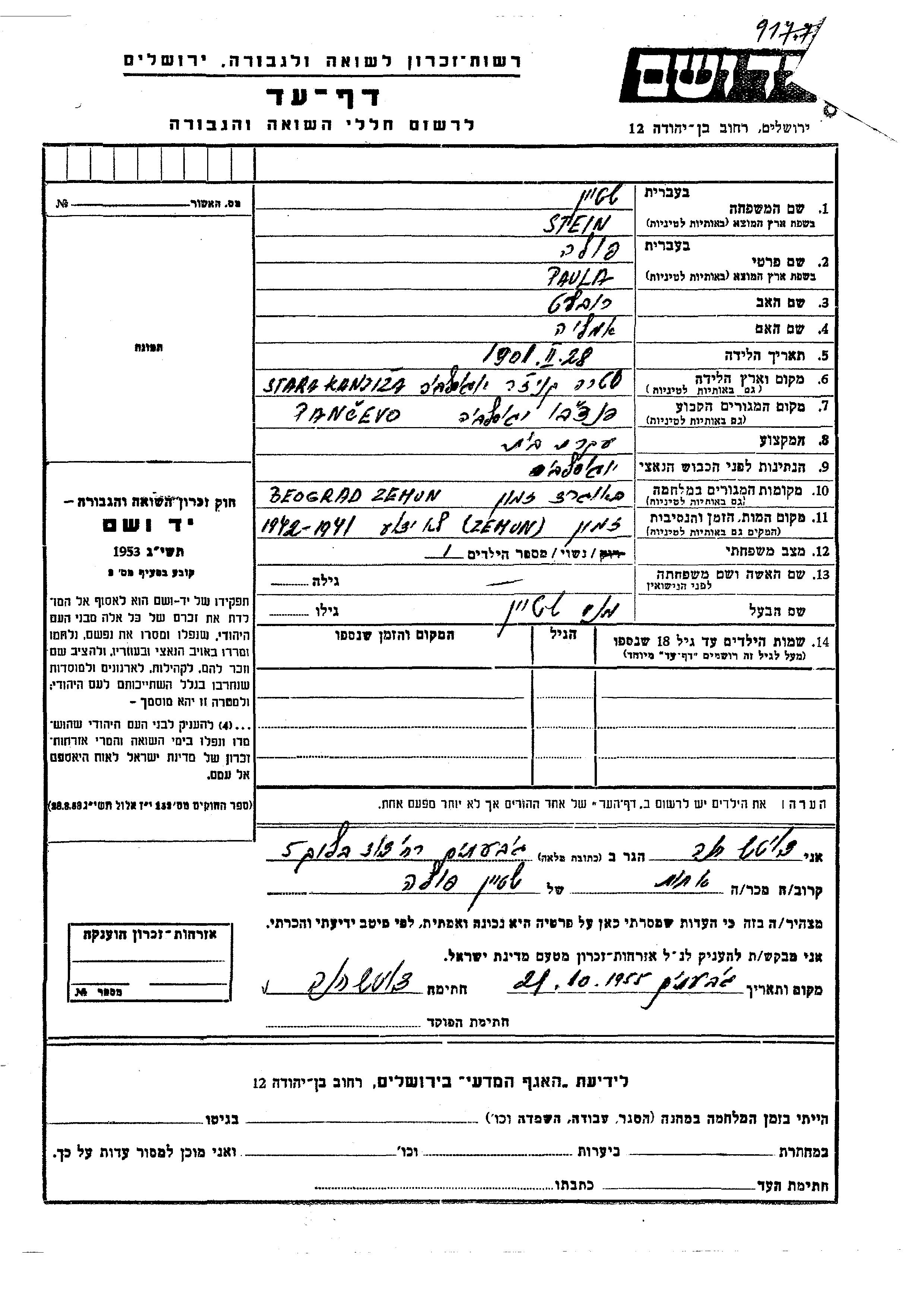 פולה Stein נולדה בStara Kanizsa שביוגוסלביה בשנת 1901 לרוברט ואמליה. היא היתה עקרת בית ונשואה למני. לפני מלחמת העולם השניה התגוררה בPancevo שביוגוסלביה. בזמן המלחמה היא היתה בBeograd שביוגוסלביה.