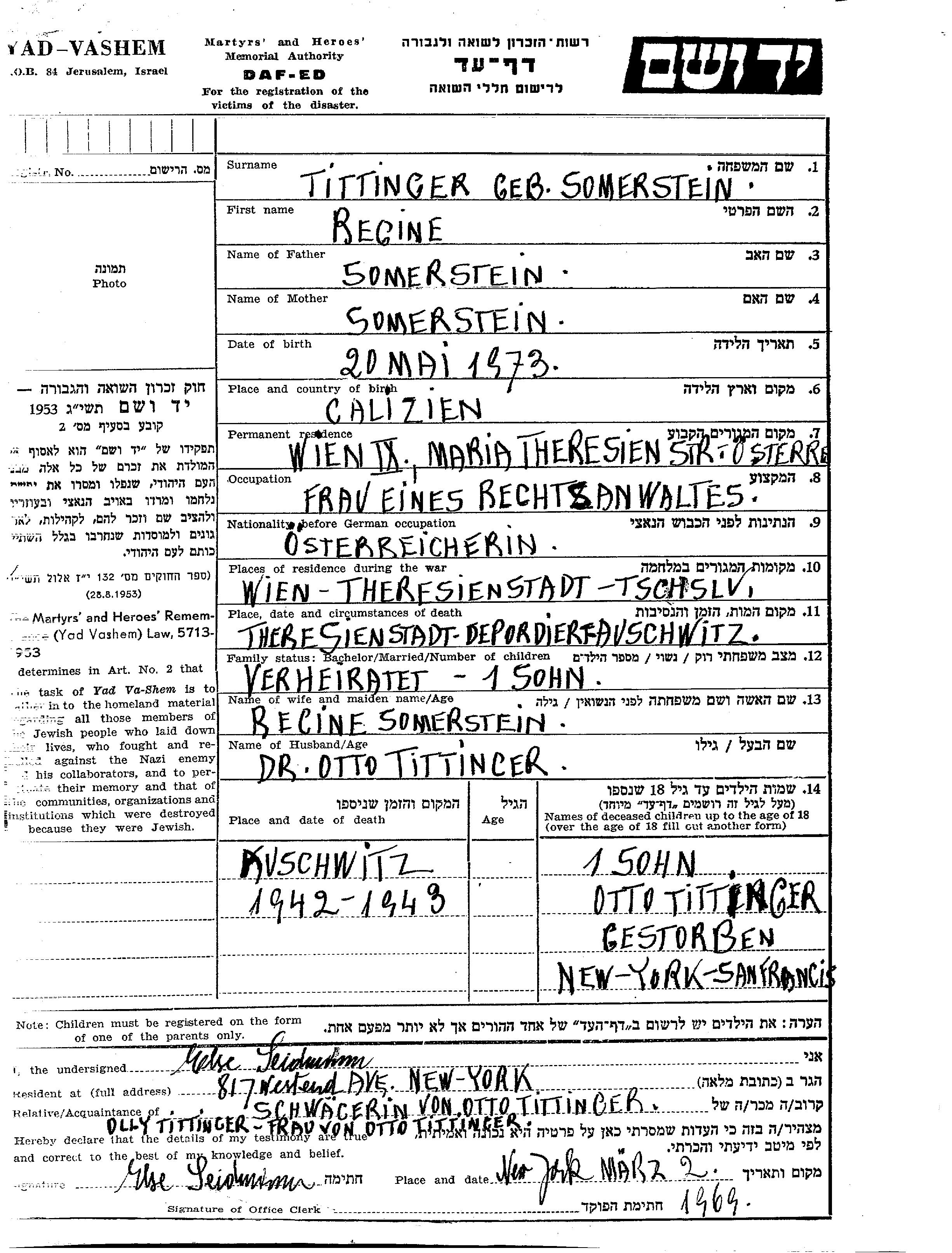 Regine Tittinger לבית Somerstein נולדה בGalicia Region שבפולין בשנת 1873. היא היתה ללא מקצוע ונשואה לאוטו. לפני מלחמת העולם השניה התגוררה בWien שבאוסטריה. בזמן המלחמה היא היתה בTheresienstadt שבצ'כוסלובקיה. היא נרצחה בשואה. מקום המוות: Auschwitz שבפולין בשנת 1942.