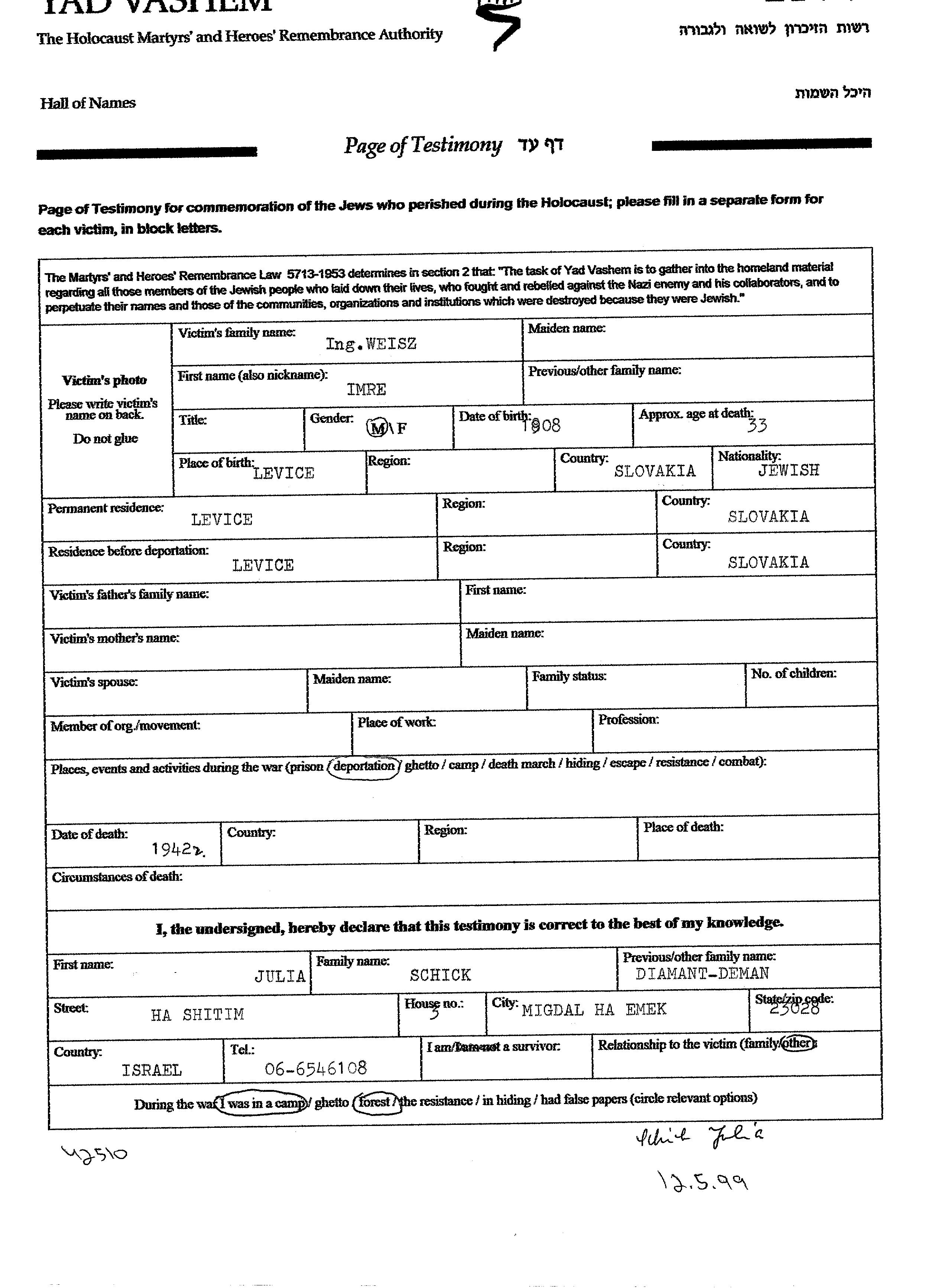 אימרה Weisz נולד בLevice שבצ'כוסלובקיה בשנת 1908. לפני מלחמת העולם השניה התגורר בLevice שבצ'כוסלובקיה.