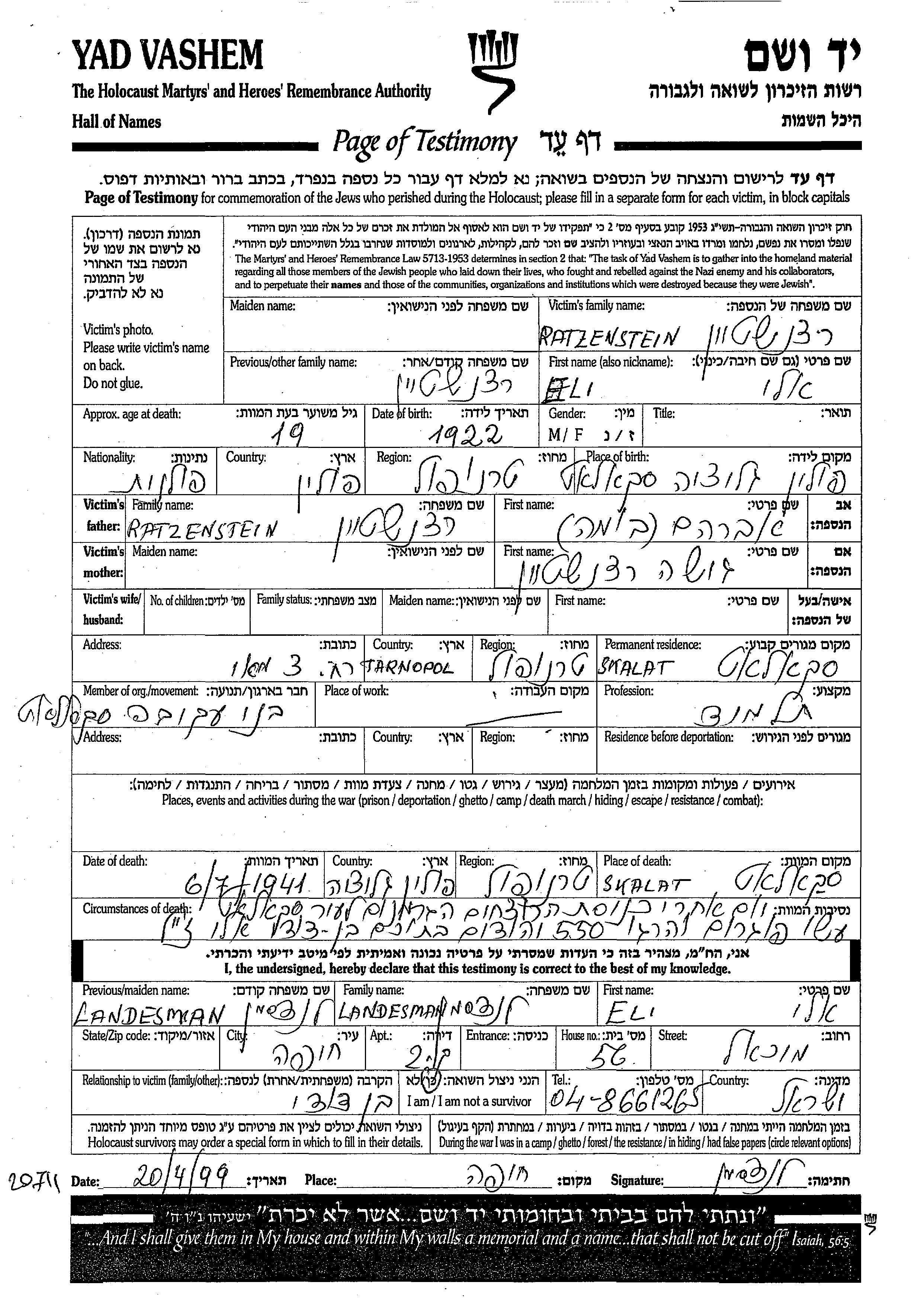אלי Eli Ratzenstein נולד בSkalat שבפולין בשנת 1922 לאברהם וגושה. הוא היה תלמיד. לפני מלחמת העולם השניה התגורר בSkalat שבפולין. אלי Eli נרצח בשואה. מקום המוות: Skalat שבפולין בשנת 06/07/1941.