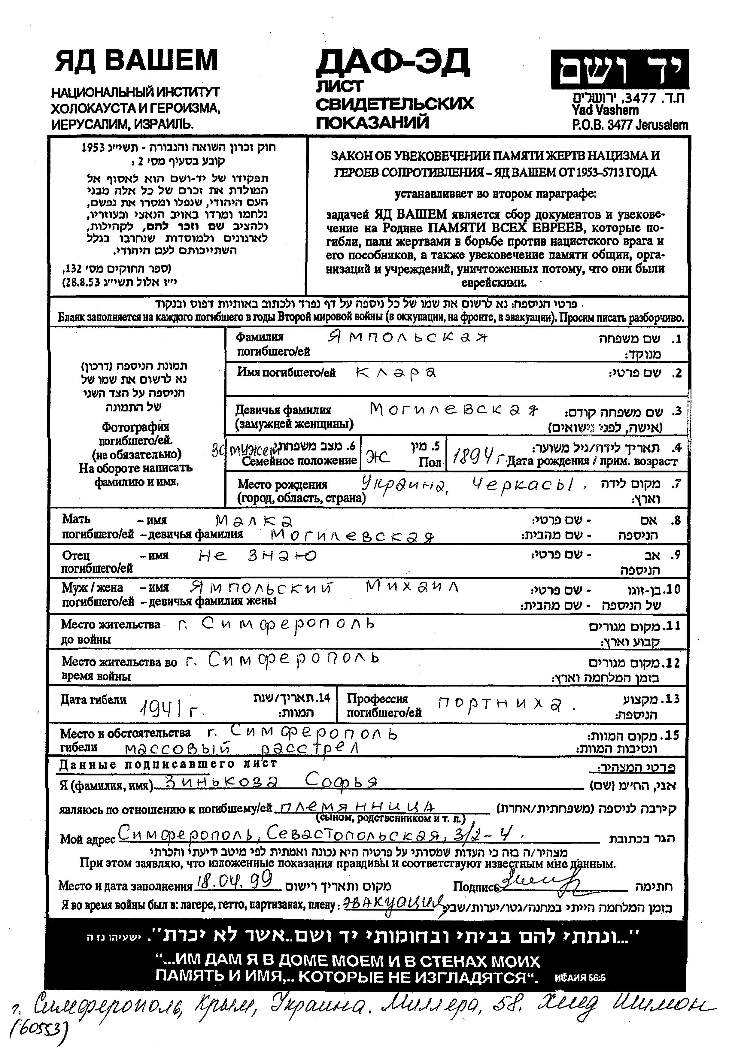 קלרה Jampolski לבית מוגילווסקי נולדה בCherkassy שבאוקראינה (ברה"מ) בשנת 1894 למלכה. היא היתה תופרת ונשואה לMikhail. לפני מלחמת העולם השניה התגוררה בSimferopol שברוסיה (ברה"מ). בזמן המלחמה היא היתה בSimferopol שברוסיה (ברה"מ). קלרה נרצחה בשואה. מקום המוות: Simferopol שברוסיה (ברה"מ) בשנת 1941.