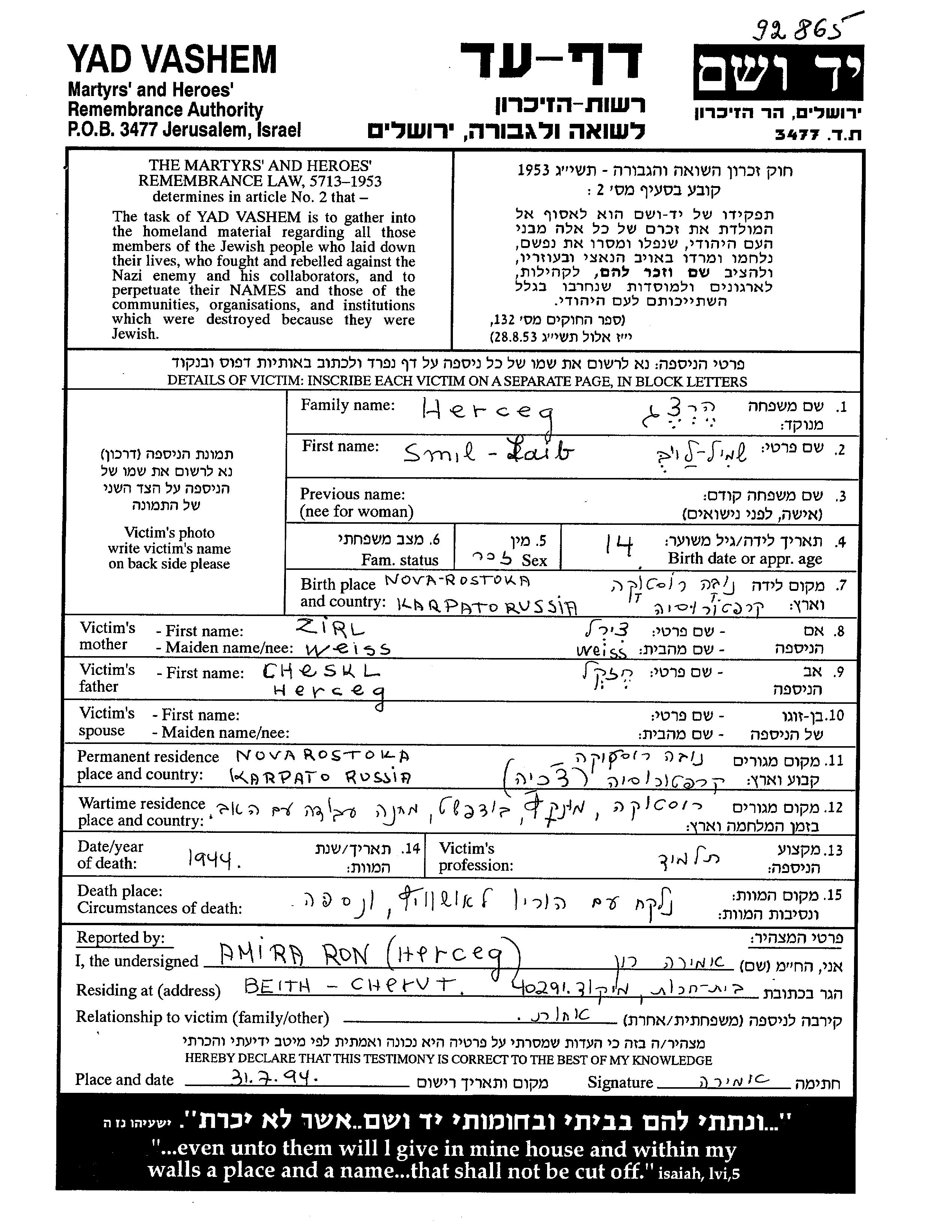 סמיל Laib Herceg נולד בNova Rostoka שבצ'כוסלובקיה לCheskl וZirl. הוא היה תלמיד וילד. לפני מלחמת העולם השניה התגורר בNova Rostoka שבצ'כוסלובקיה. בזמן המלחמה הוא היה בMunkatsch שבצ'כוסלובקיה.