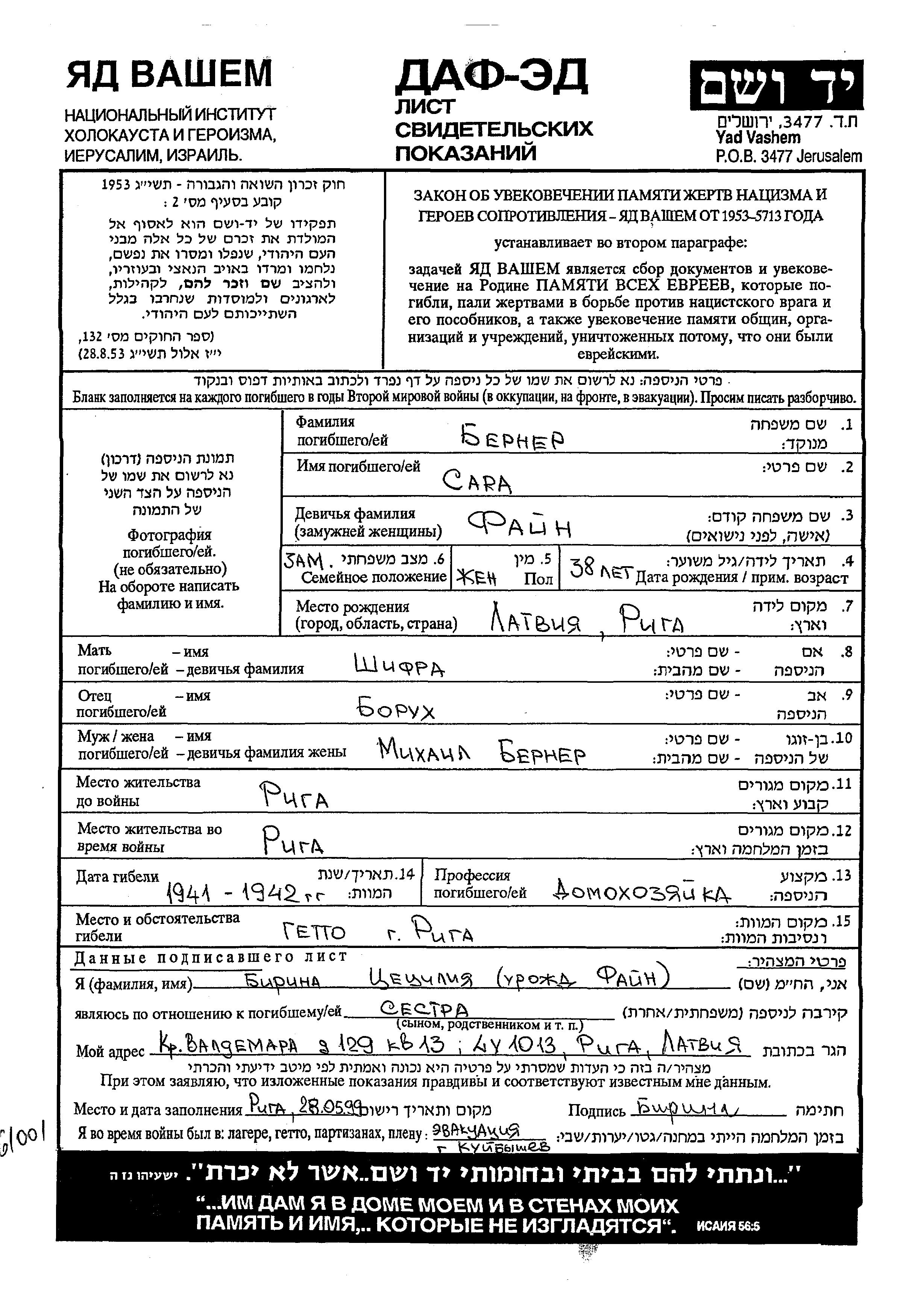 שרה נרצחה בשואה. מקום המוות: Riga שבלטביה בשנת 1941.