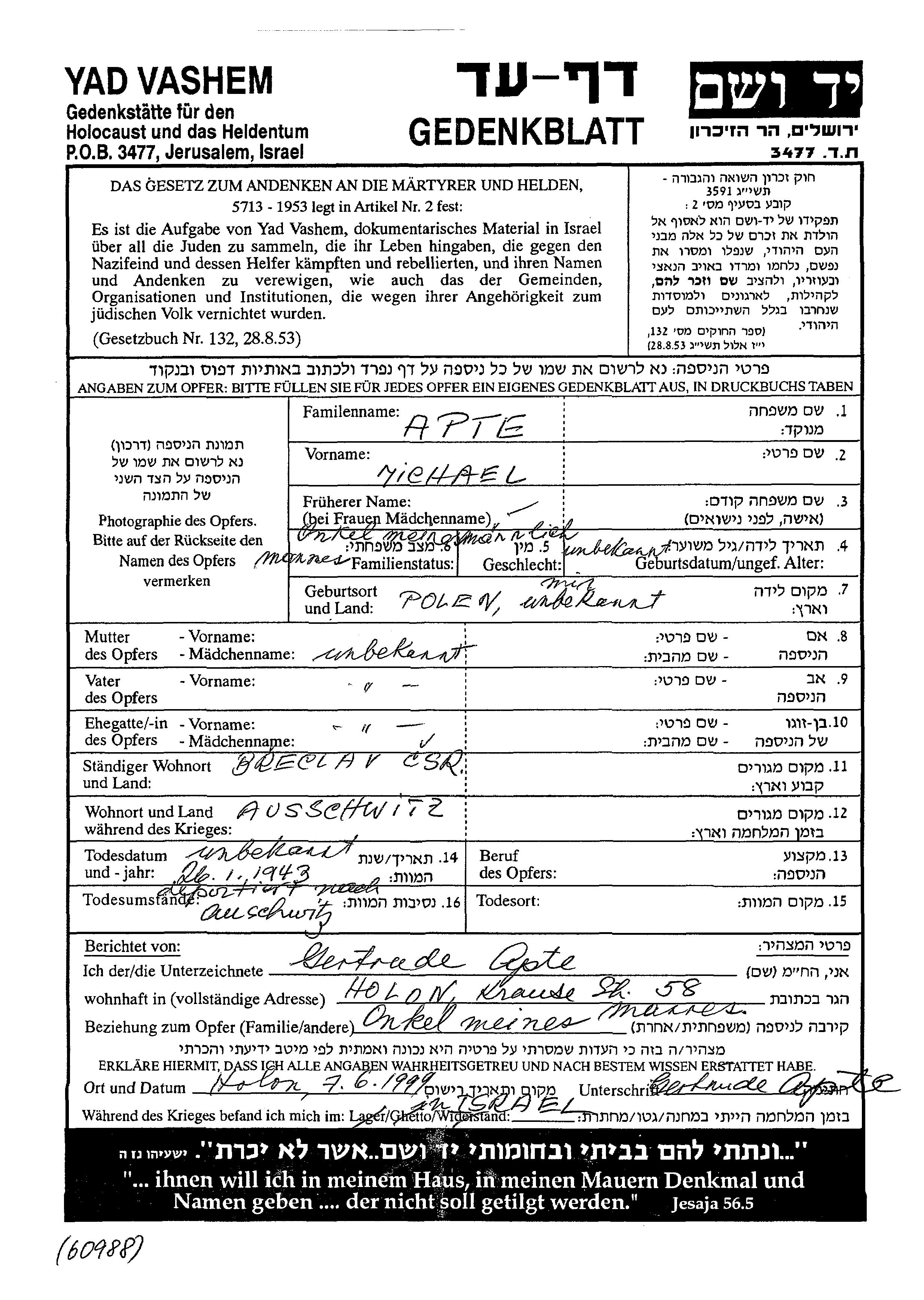 מיכאל נרצח בשואה. מקום המוות: Auschwitz שבפולין בשנת 26/01/1943.