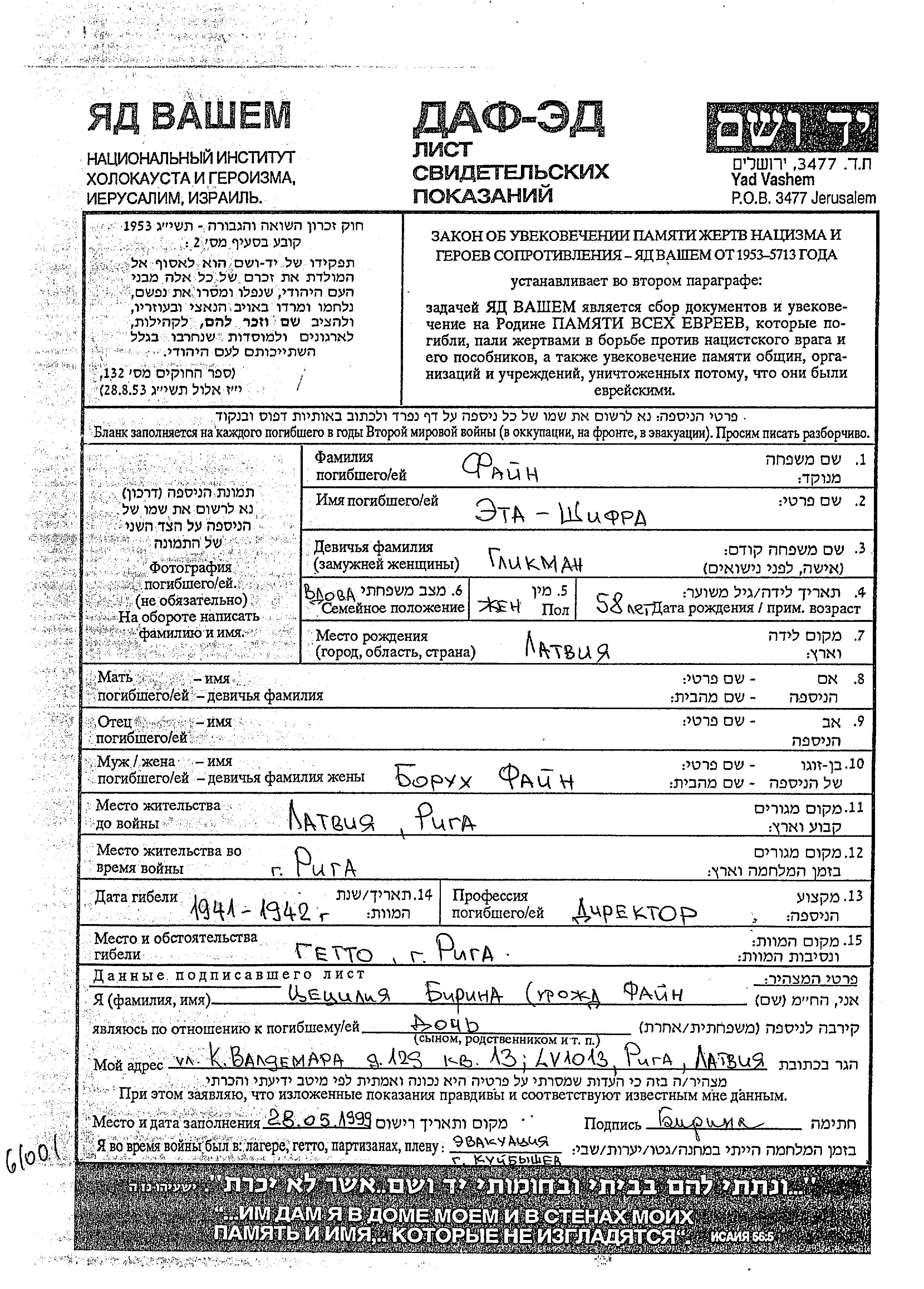 Eta שפרה Fain לבית גליקמן נולדה בלטביה. היא היתה Direktor ואלמנה לבורוך. לפני מלחמת העולם השניה התגוררה בRiga שבלטביה. בזמן המלחמה היא היתה בRiga שבלטביה.
