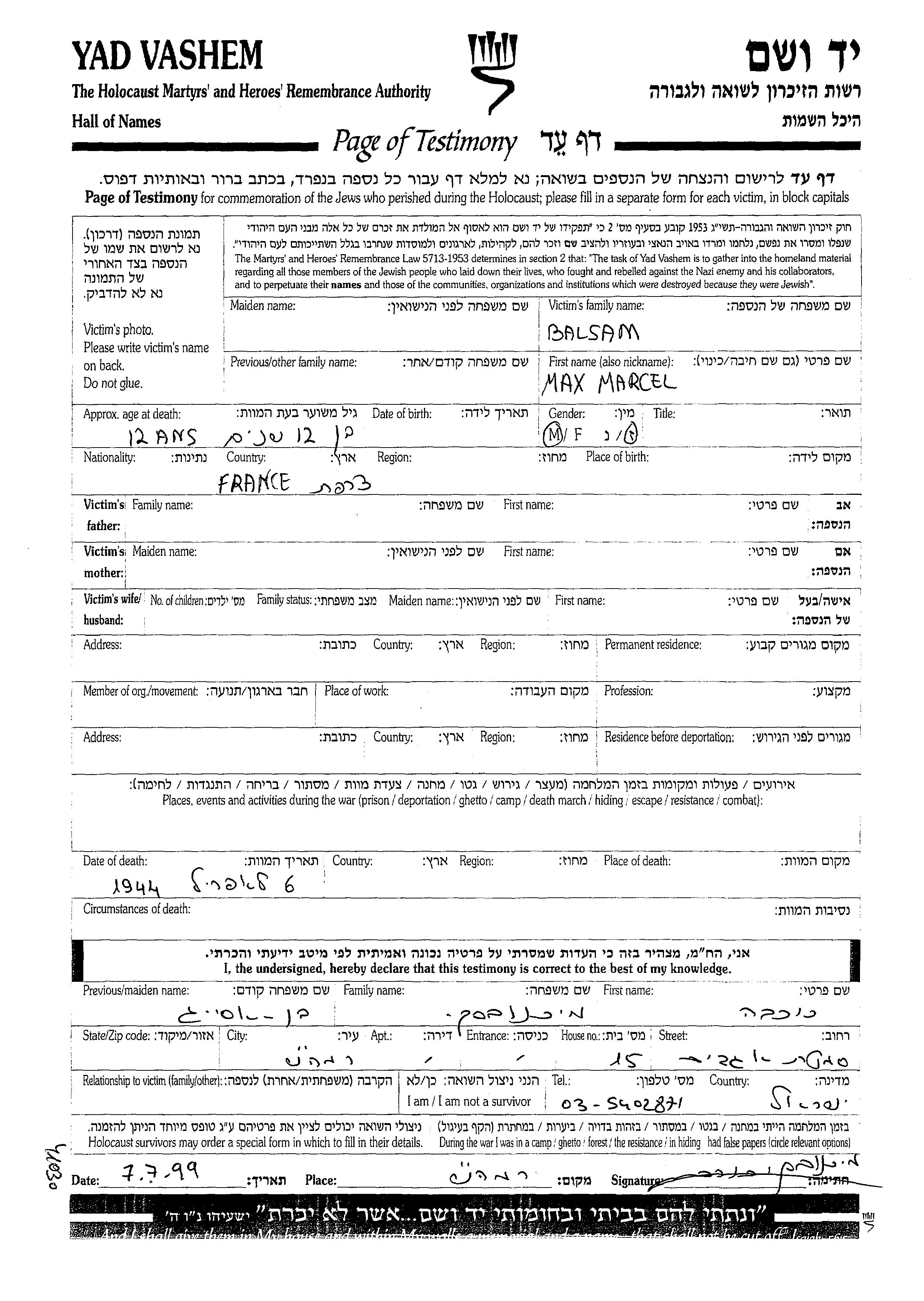 מקס Marcel בלסם נולד בצרפת שבצרפת. הוא היה ילד. לפני מלחמת העולם השניה התגורר במקום לא רשום. מקס Marcel נרצח בשואה. מקום המוות: לא ידוע בשנת 06/04/1944.