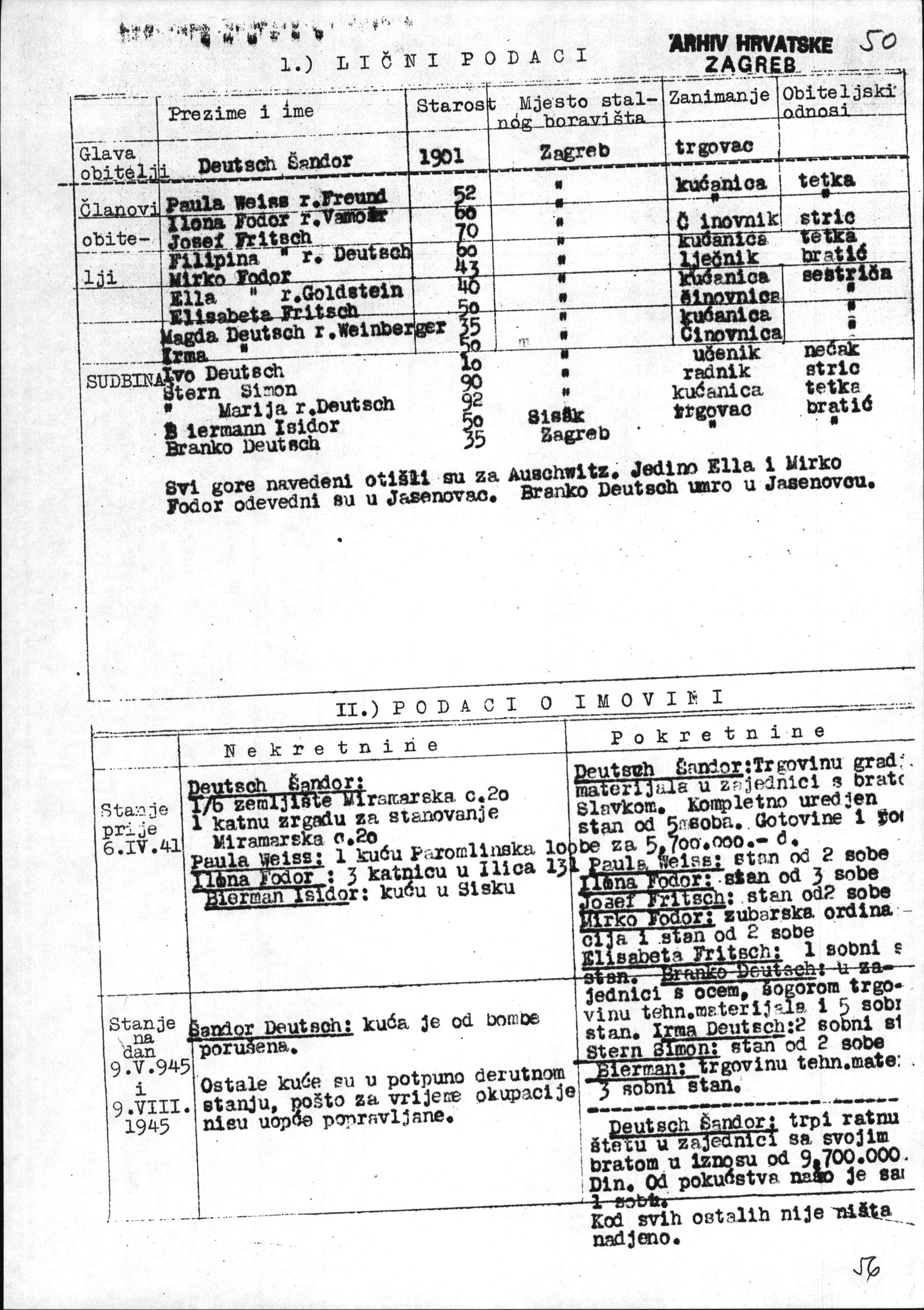 רשימה מ-1945 ובה שמות יהודים מ-Zagreb והסביבה ובכלל זה גורלם ופירוט הנזק שנגרם לרכושם, אותיות A-W