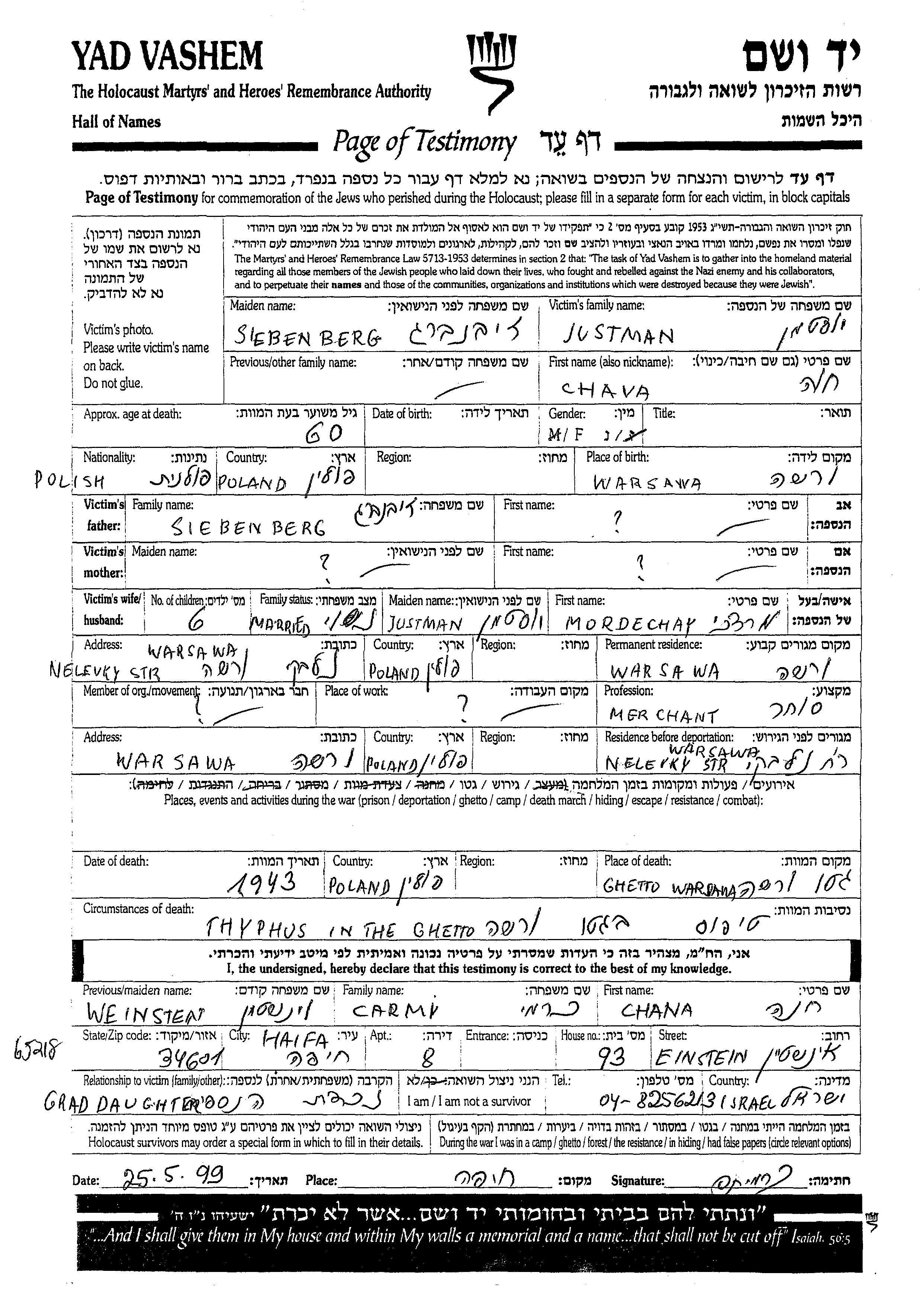 Chava Justman לבית Siebenberg נולדה בWarsaw שבפולין. היא היתה סוחרת ונשואה לMordechay. לפני מלחמת העולם השניה התגוררה בWarsaw שבפולין. בזמן המלחמה היא היתה בWarsaw שבפולין.