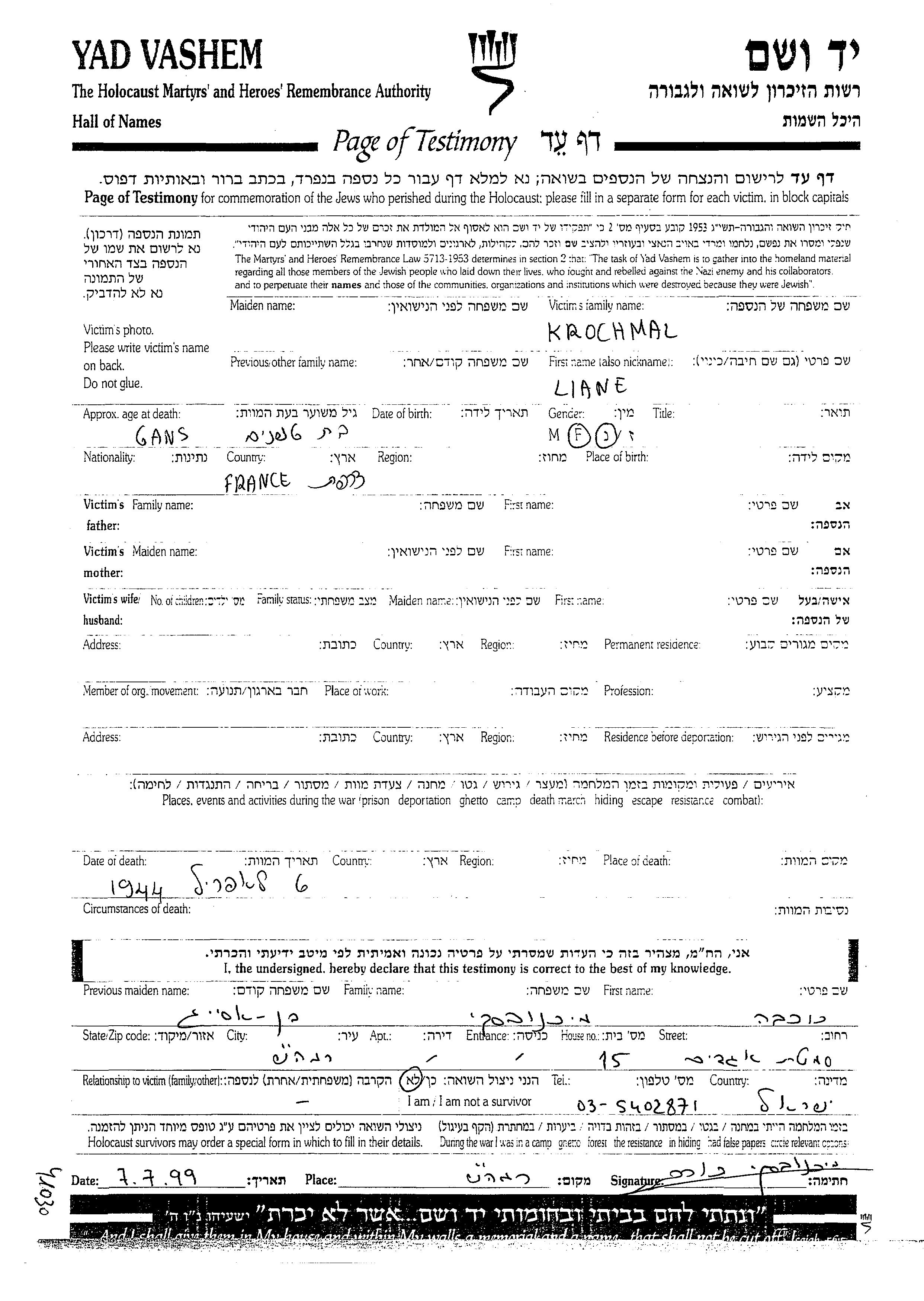 ליאנה נרצחה בשואה. מקום המוות: לא ידוע בשנת 06/04/1944.