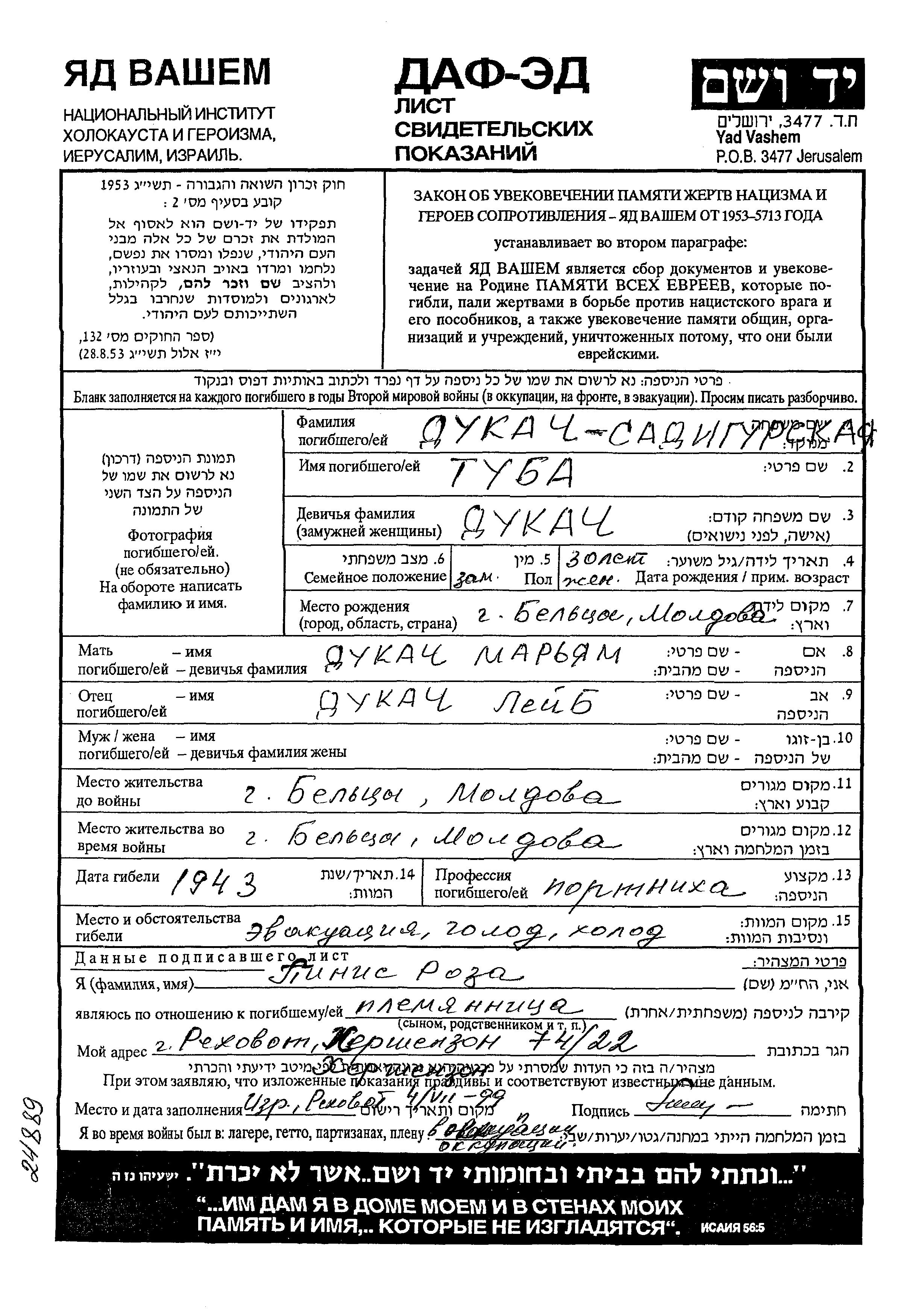 טובה נרצחה בשואה. מקום המוות: לא ידוע בשנת 1943.