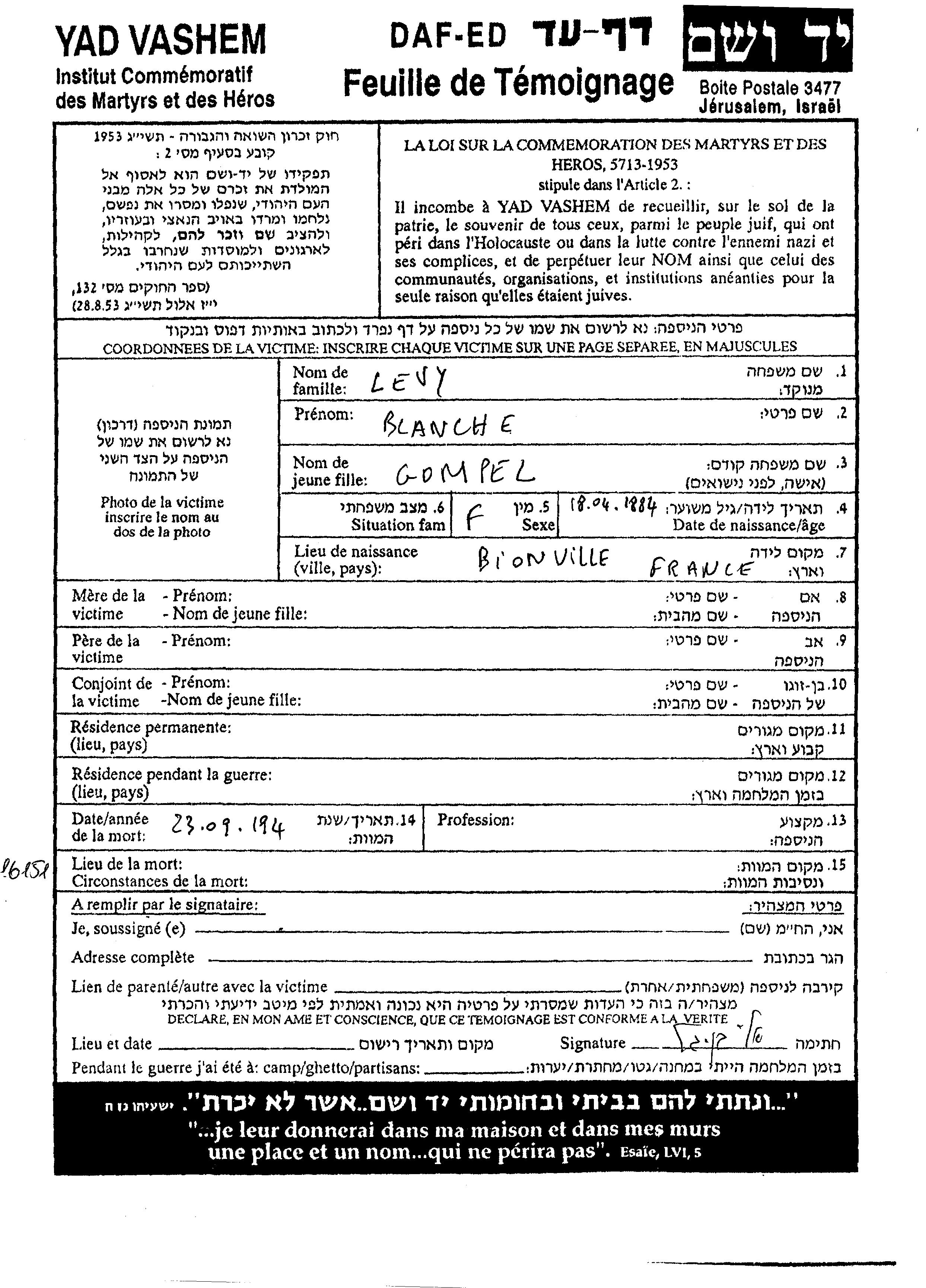 Blanche Levy לבית Gompel נולדה בBionville שבצרפת בשנת 1884. לפני מלחמת העולם השניה התגוררה במקום לא רשום.