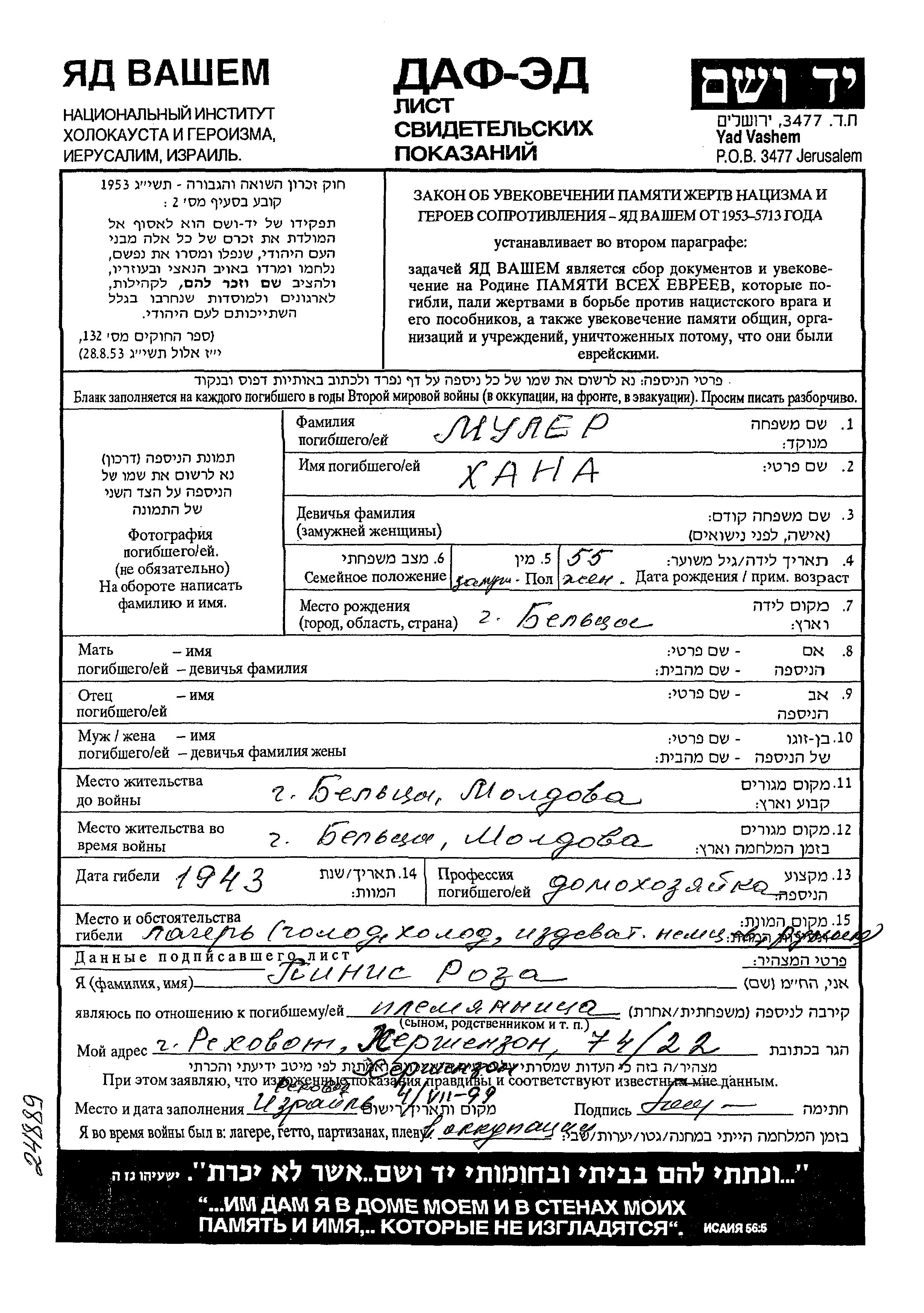 חנה Muler נולדה בBeltsy שברומניה. היא היתה עקרת בית ונשואה. לפני מלחמת העולם השניה התגוררה בBeltsy שברומניה. בזמן המלחמה היא היתה בBeltsy שברומניה.