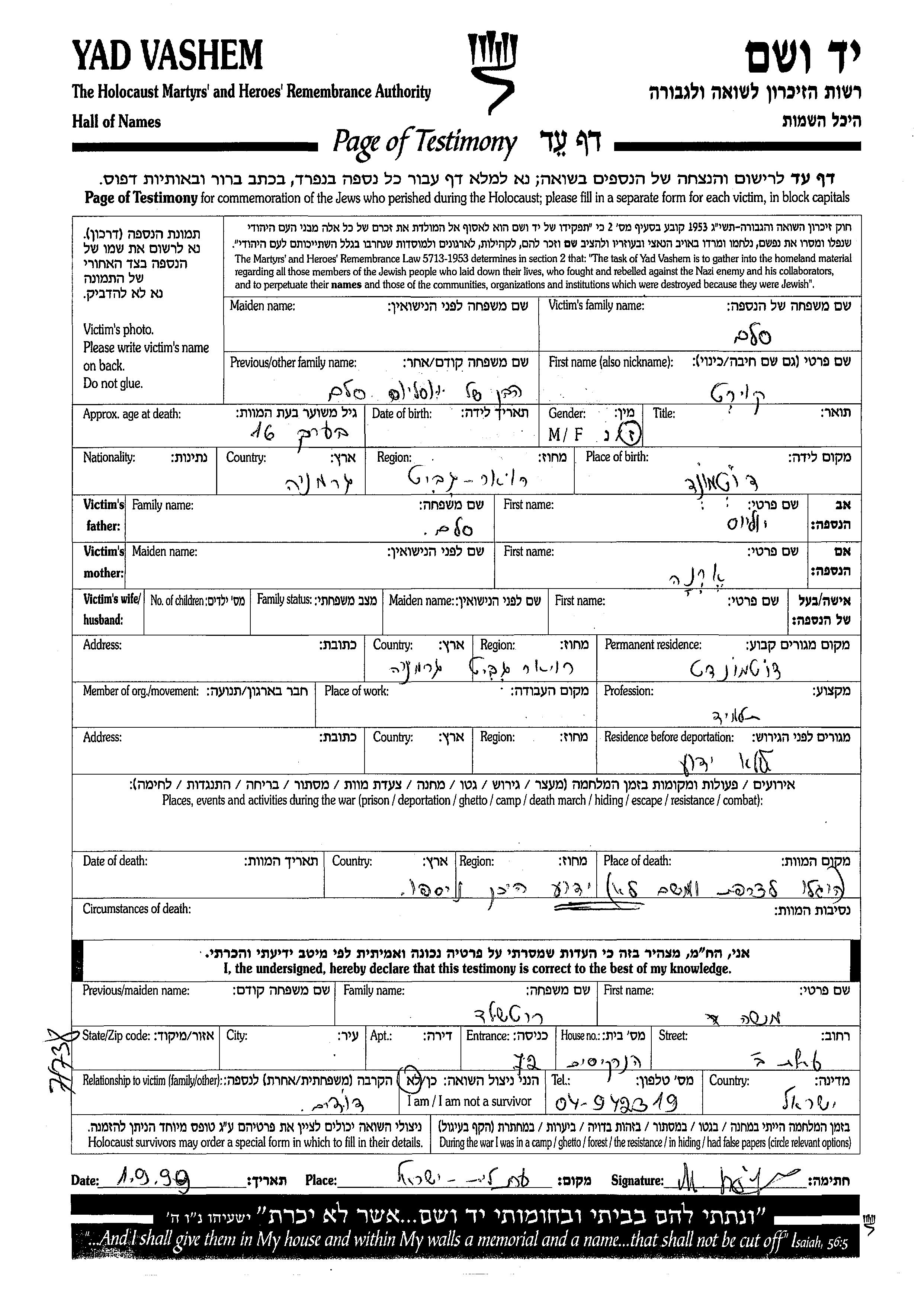 קורט סלם נולד בDortmund שבגרמניה ליוליוס וארנה. הוא היה תלמיד. לפני מלחמת העולם השניה התגורר בDortmund שבגרמניה. קורט נרצח בשואה. מקום המוות: צרפת שבצרפת.
