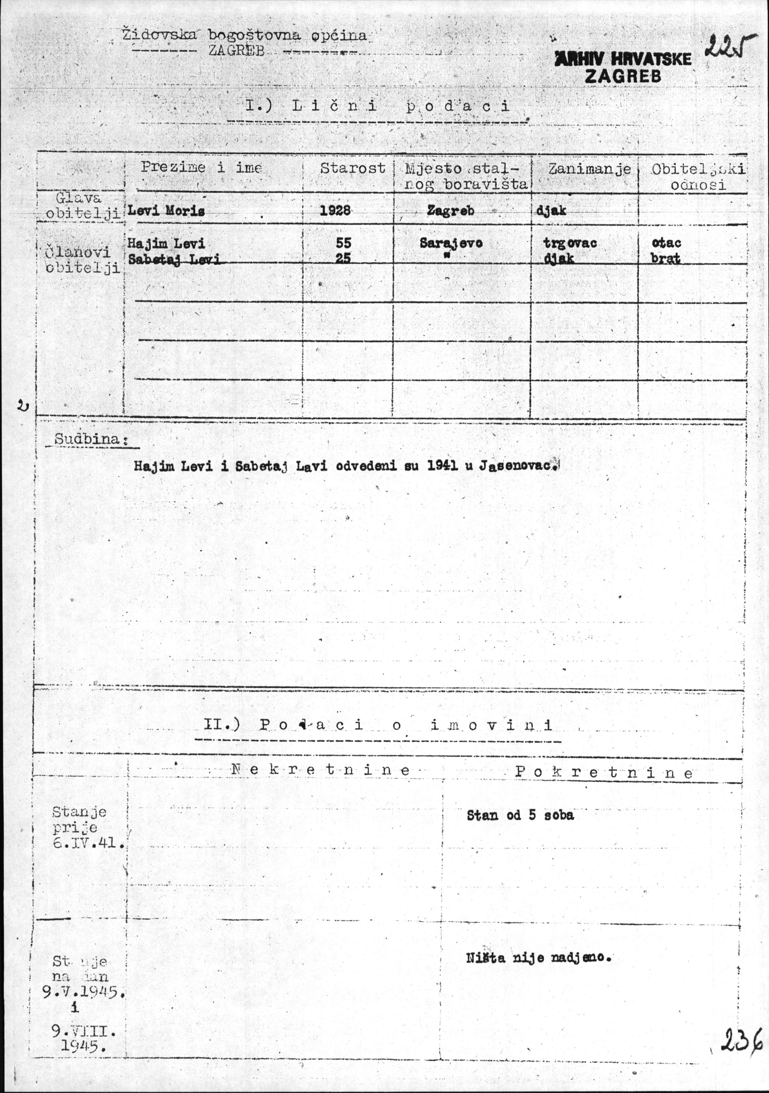 Sabetaj Levi נולד לHajim. לפני מלחמת העולם השניה התגורר בSarajevo שביוגוסלביה. בזמן המלחמה הוא היה בJasenovac שביוגוסלביה.