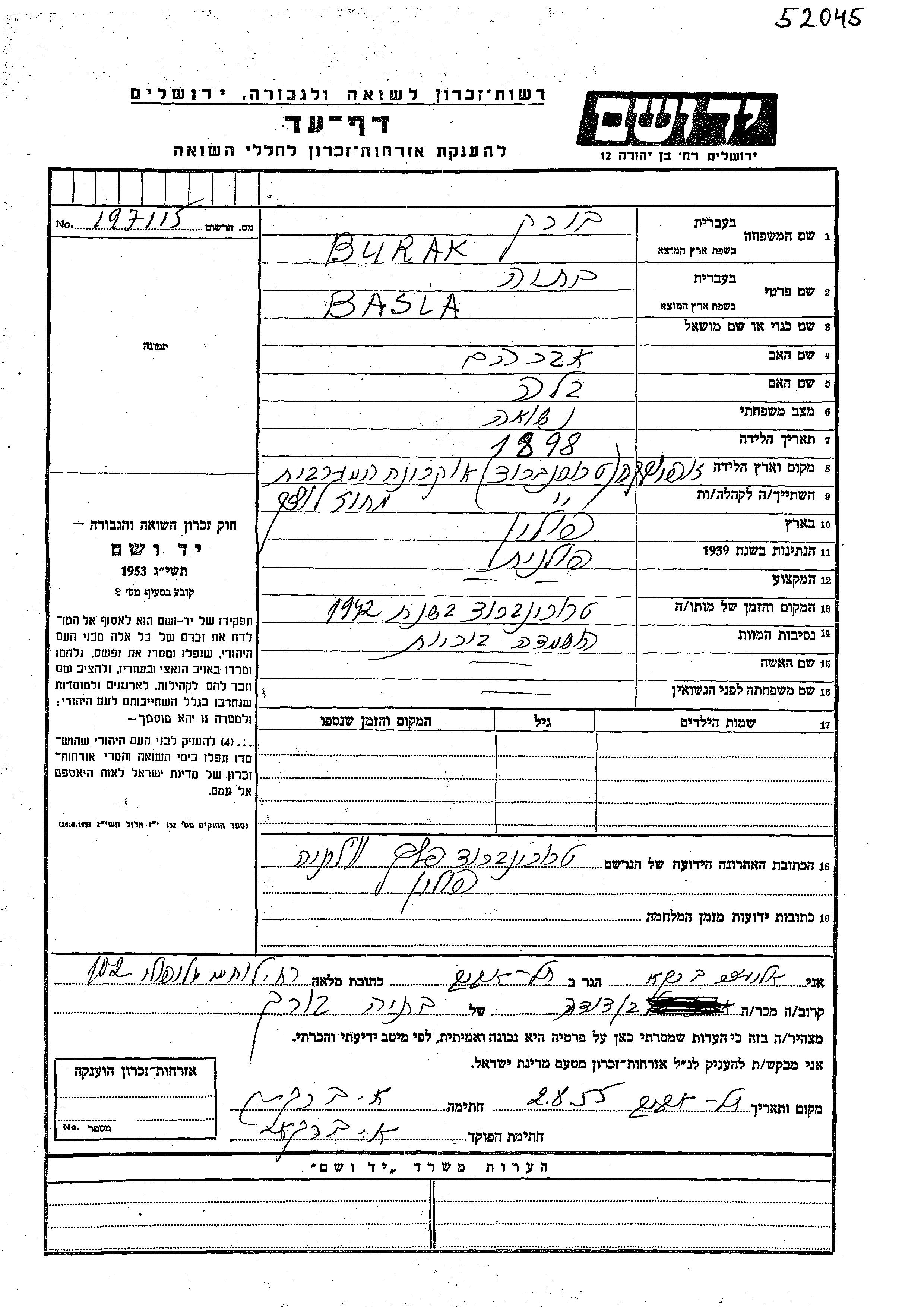 Basia בורק נולדה בZofjówka שבפולין בשנת 1898 לאברהם ובלה. היא היתה נשואה. לפני מלחמת העולם השניה התגוררה בZofjówka שבפולין. בזמן המלחמה היא היתה בTrochenbrod שבפולין.
