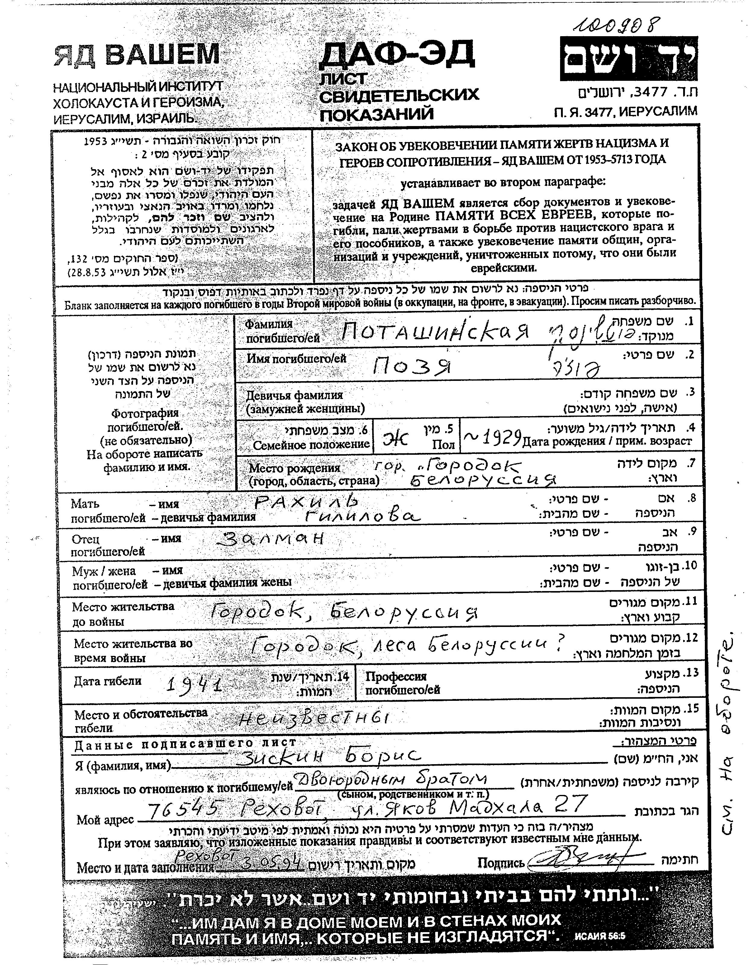 Pozia פוטשינסקי נולדה בGorodok שבביאלורוסיה (ברה"מ) בשנת 1929 לזלמן וRakhil לבית גילילוב. היא היתה ילדה. לפני מלחמת העולם השניה התגוררה בGorodok שבביאלורוסיה (ברה"מ). בזמן המלחמה היא היתה בGorodok שבביאלורוסיה (ברה"מ).