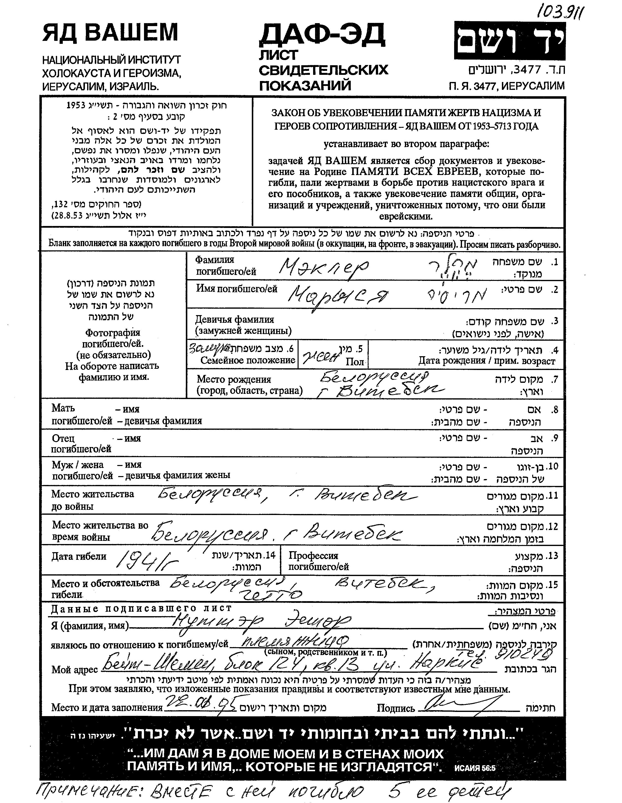 היא נרצחה בשואה. מקום המוות: Vitebsk שבביאלורוסיה (ברה"מ) בשנת 1941.