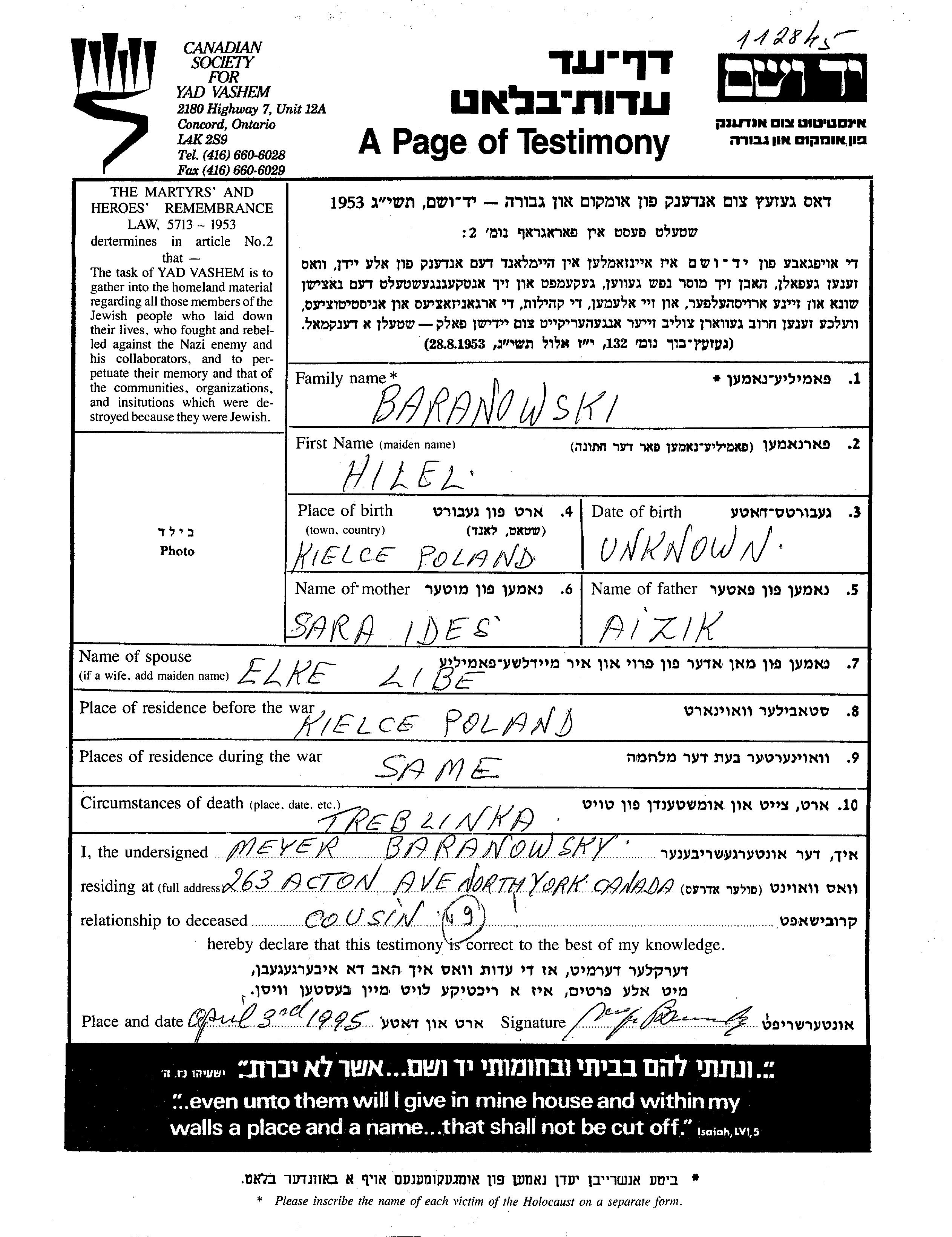 הילל Baranowsky נולד בKielce שבפולין לAizik וIdes שרה. הוא היה נשוי לElke ליבה. לפני מלחמת העולם השניה התגורר בKielce שבפולין. בזמן המלחמה הוא היה בKielce שבפולין. הילל נרצח בשואה. מקום המוות: Treblinka שבפולין.