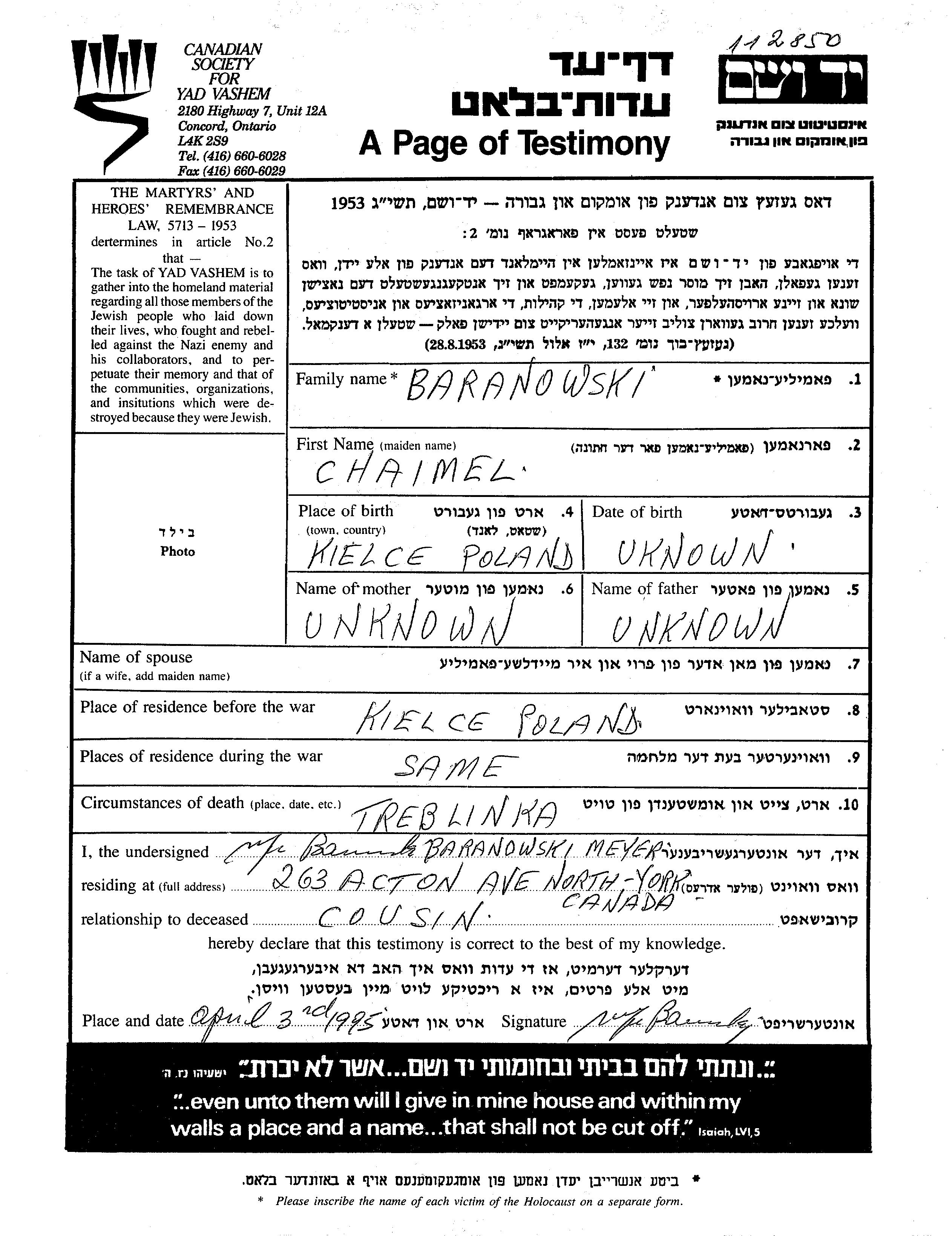 Chaimel Baranowsky נולד בKielce שבפולין. לפני מלחמת העולם השניה התגורר בKielce שבפולין. בזמן המלחמה הוא היה בKielce שבפולין.