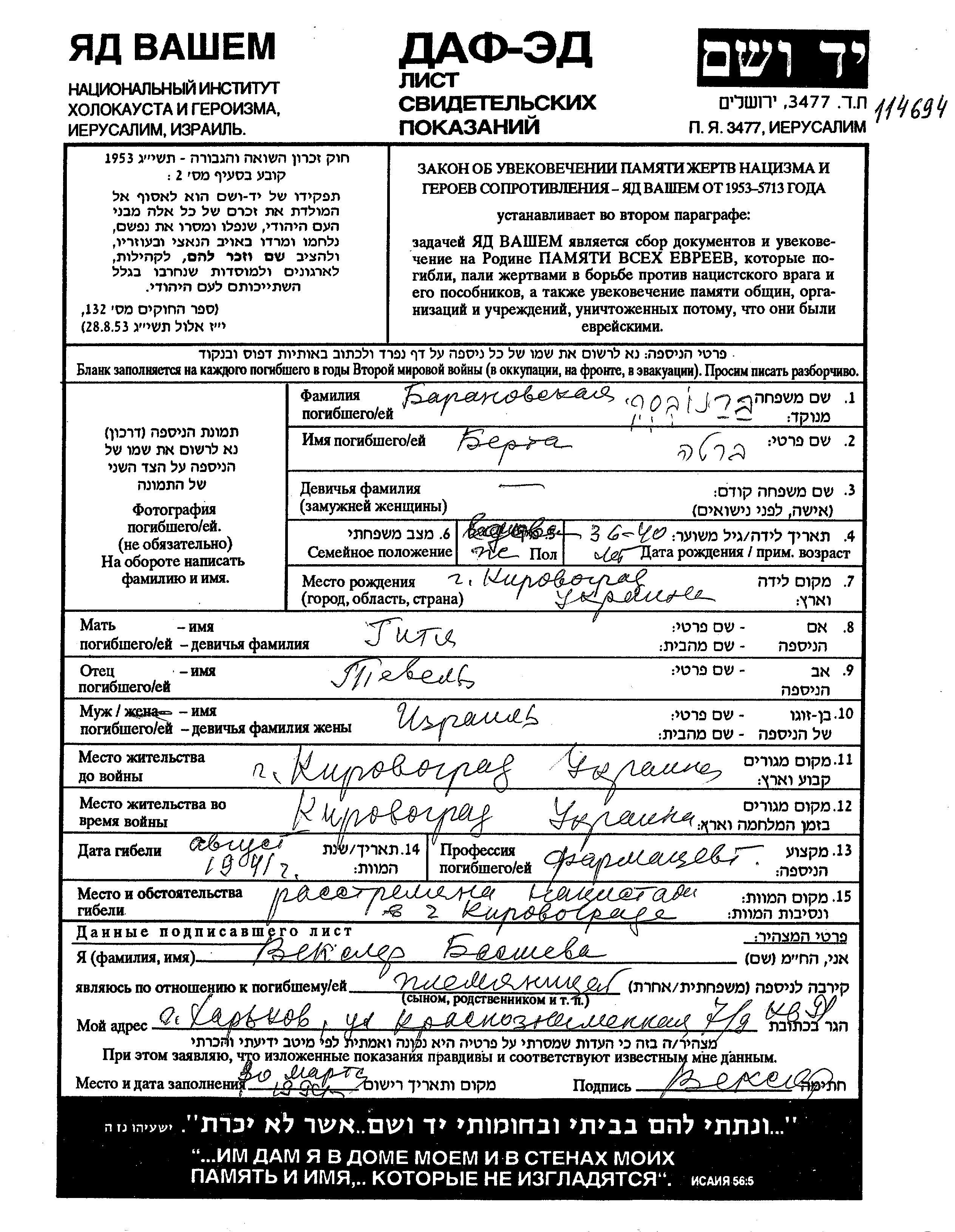 ברטה ברנובסקי נולדה בKirovograd שבאוקראינה (ברה"מ) בשנת 1903 לטבל וGitia. היא היתה רוקחת ואלמנה לIzrail. לפני מלחמת העולם השניה התגוררה בKirovograd שבאוקראינה (ברה"מ). בזמן המלחמה היא היתה בKirovograd שבאוקראינה (ברה"מ). ברטה נרצחה בשואה. מקום המוות: Kirovograd שבאוקראינה (ברה"מ) בשנת 1941.