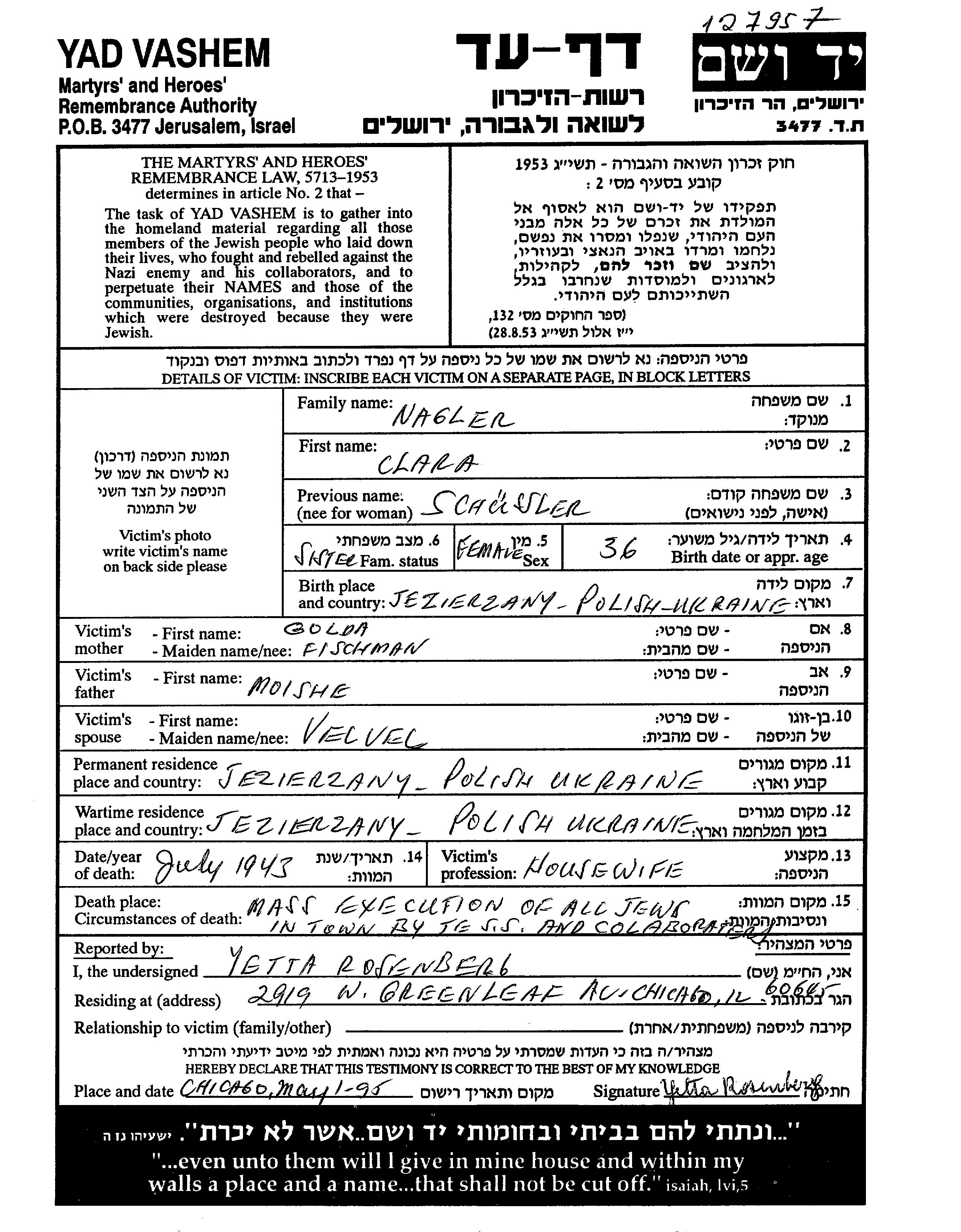 Clara נגלר לבית Schuessler נולדה בJezierzany שבפולין בשנת 1907 לMoishe וגולדה לבית Fischman. היא היתה עקרת בית ונשואה לVelvel. לפני מלחמת העולם השניה התגוררה בJezierzany שבפולין. בזמן המלחמה היא היתה בJezierzany שבפולין.