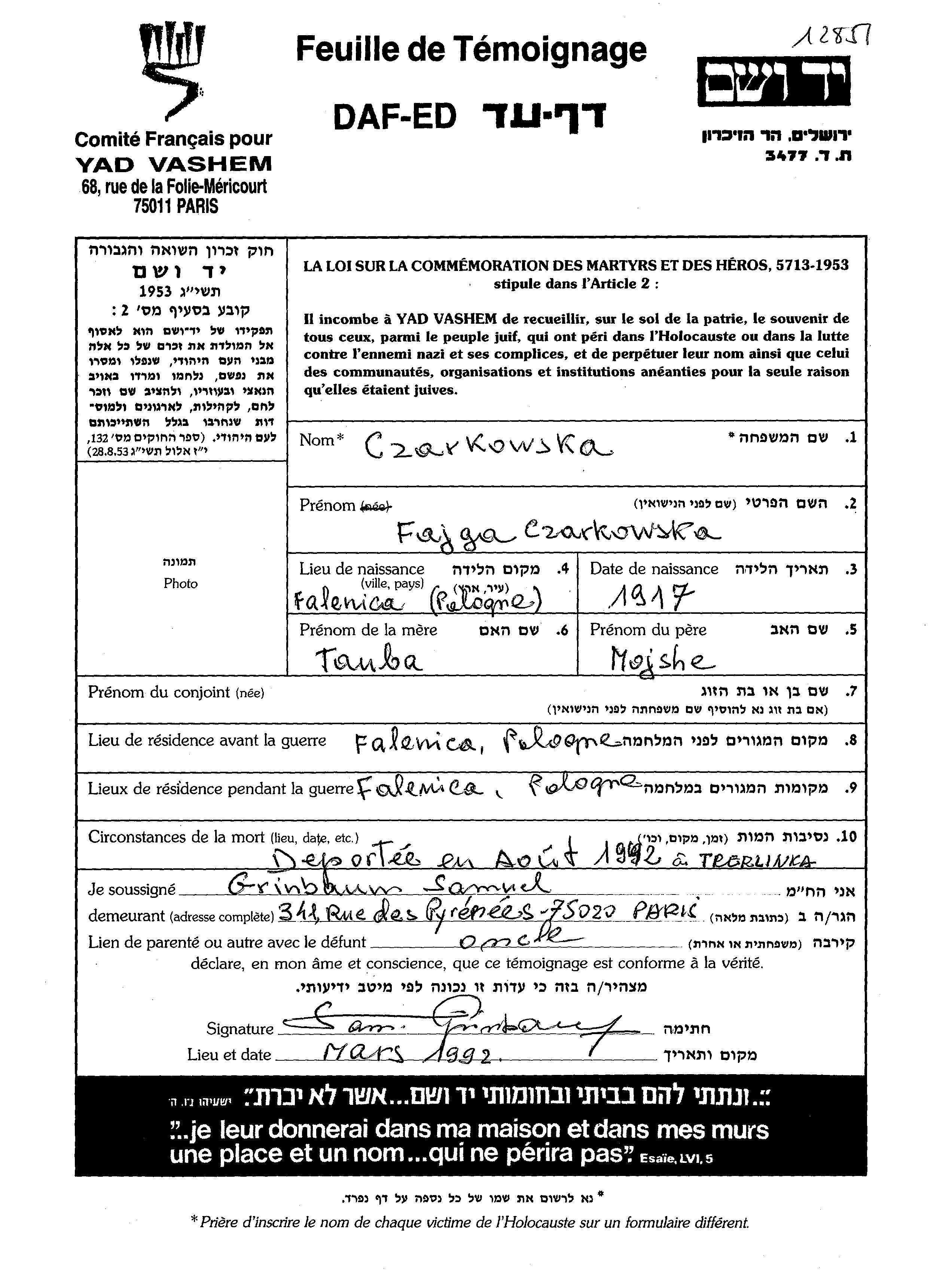 Fajga Czarkowski נולדה בFalenica שבפולין בשנת 1917 לMojshe וטאובה לבית גרינבאום. לפני מלחמת העולם השניה התגוררה בFalenica שבפולין. בזמן המלחמה היא היתה בFalenica שבפולין. היא נרצחה בשואה. מקום המוות: Treblinka שבפולין בשנת 1942.