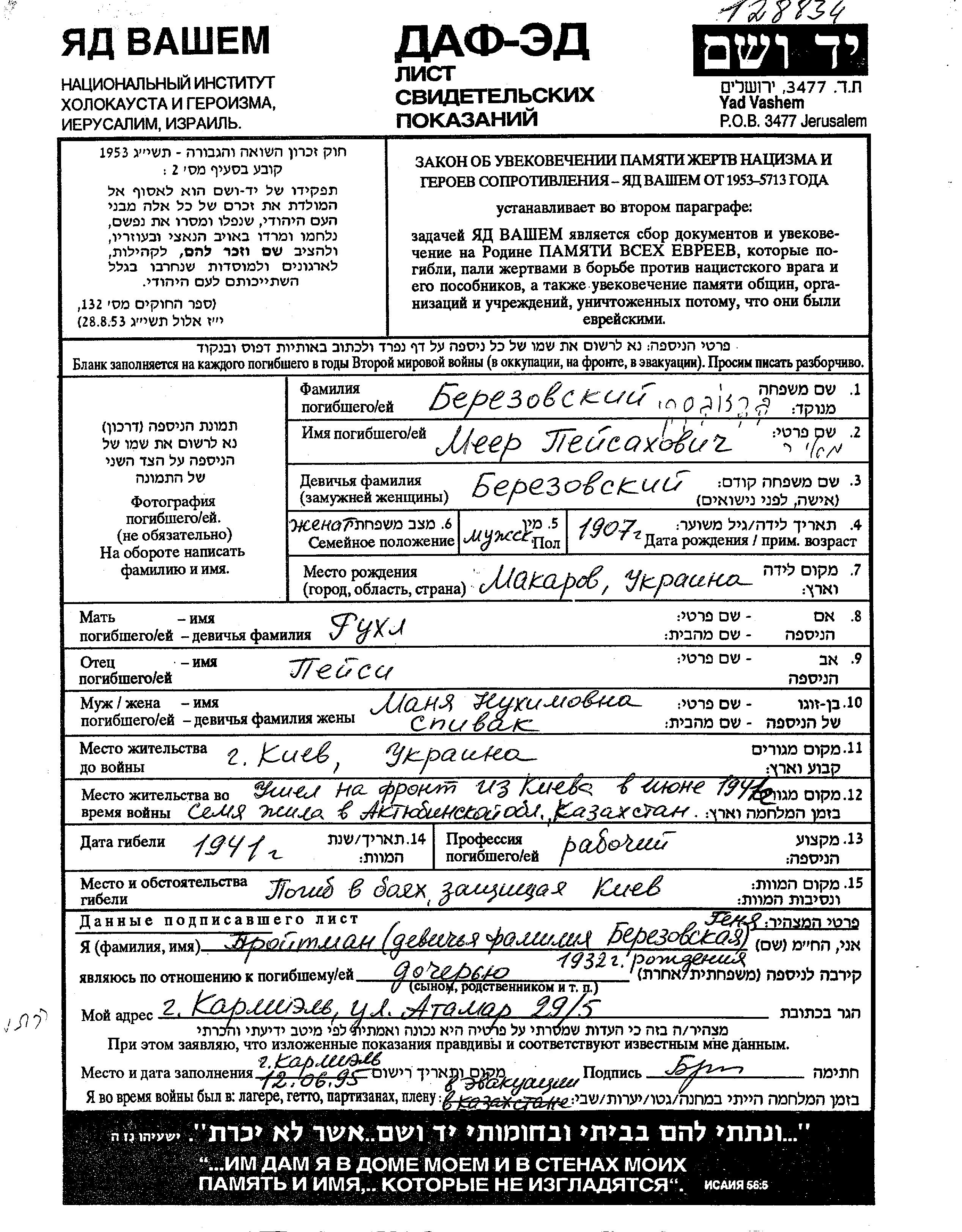 Meyer ברזובסקי נולד בMakarov שבאוקראינה (ברה"מ) בשנת 1907 לPeisi וRukhl. הוא היה פועל ונשוי למניה. לפני מלחמת העולם השניה התגורר בKiev שבאוקראינה (ברה"מ). בזמן המלחמה הוא היה בצבא הסובייטי. הוא נהרג בשירות צבאי. מקום המוות: Kiev שבאוקראינה (ברה"מ) בשנת 1941.