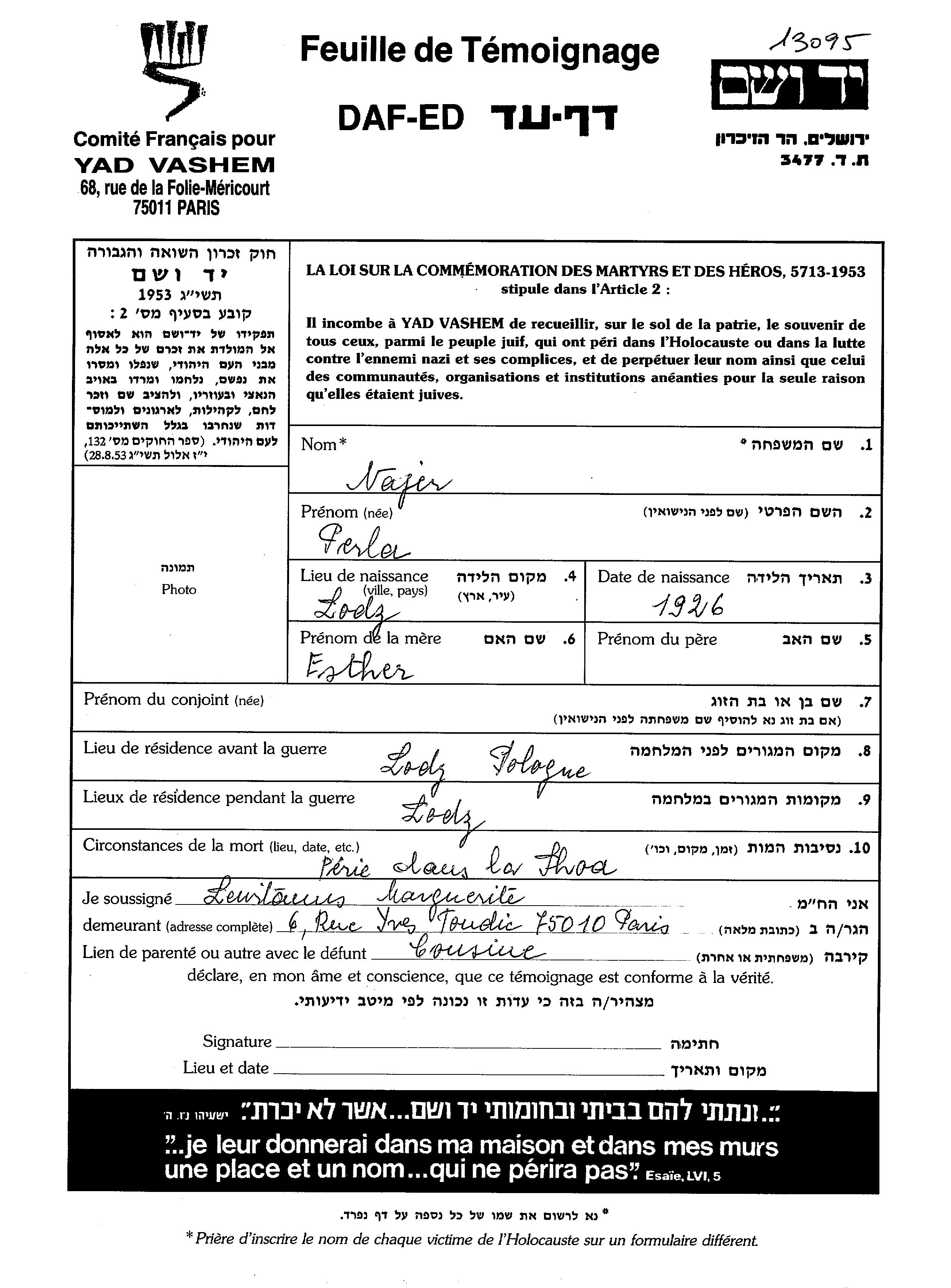Perla Najer נולדה בLodz שבפולין בשנת 1926 לאסתר לבית ברלינר. לפני מלחמת העולם השניה התגוררה בLodz שבפולין. בזמן המלחמה היא היתה בLodz שבפולין.