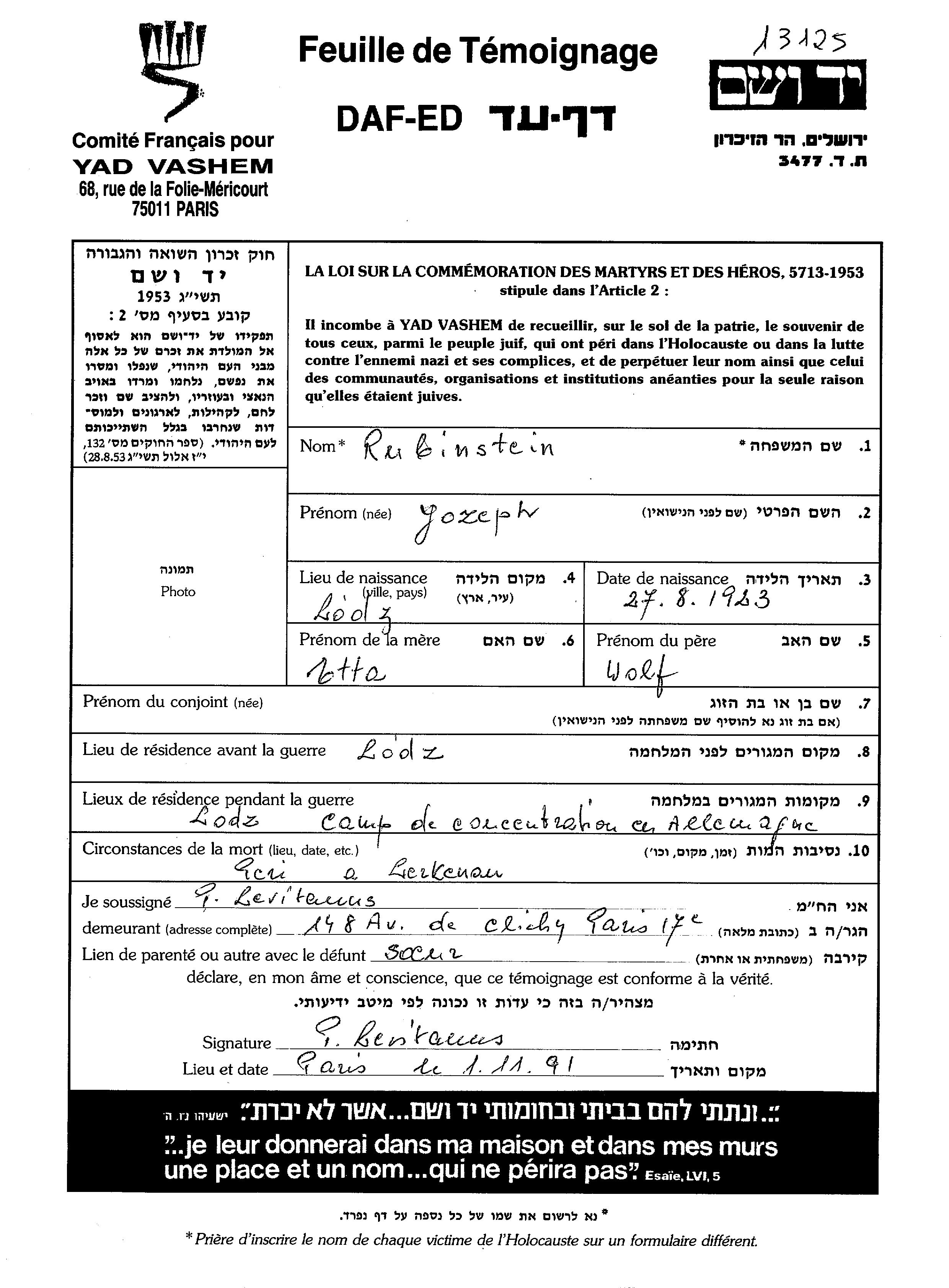 Jozeph Rubinstein נולד בLodz שבפולין בשנת 1923 לWolf וEtta. הוא היה ילד. לפני מלחמת העולם השניה התגורר בLodz שבפולין. בזמן המלחמה הוא היה בLodz שבפולין.