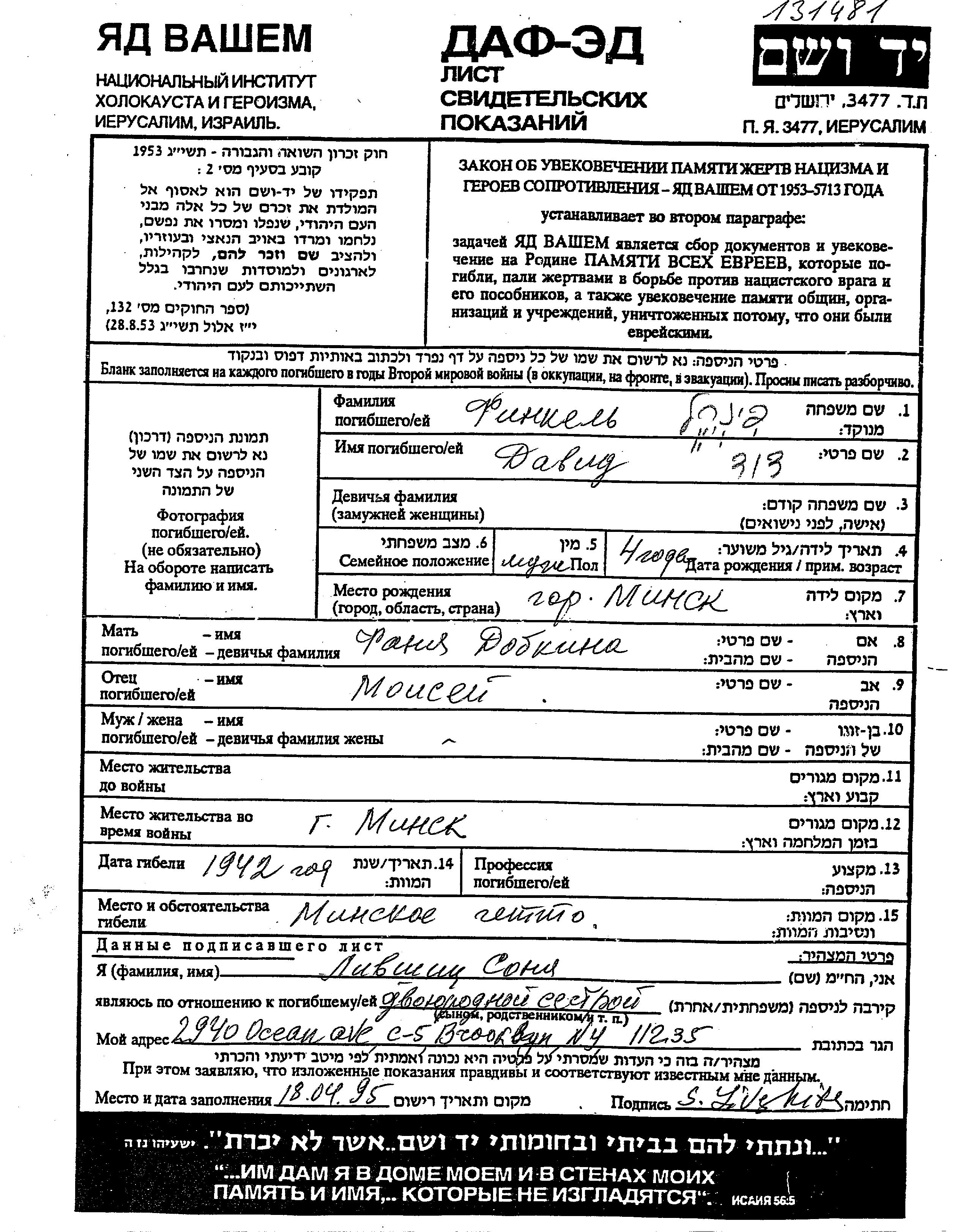 דוד פינקל נולד בMinsk שבביאלורוסיה (ברה"מ) בשנת 1938 למואיסאי ופניה לבית דובקין. הוא היה ילד. לפני מלחמת העולם השניה התגורר בMinsk שבביאלורוסיה (ברה"מ). בזמן המלחמה הוא היה בMinsk שבביאלורוסיה (ברה"מ). דוד נרצח בשואה. מקום המוות: Minsk שבביאלורוסיה (ברה"מ) בשנת 1942.