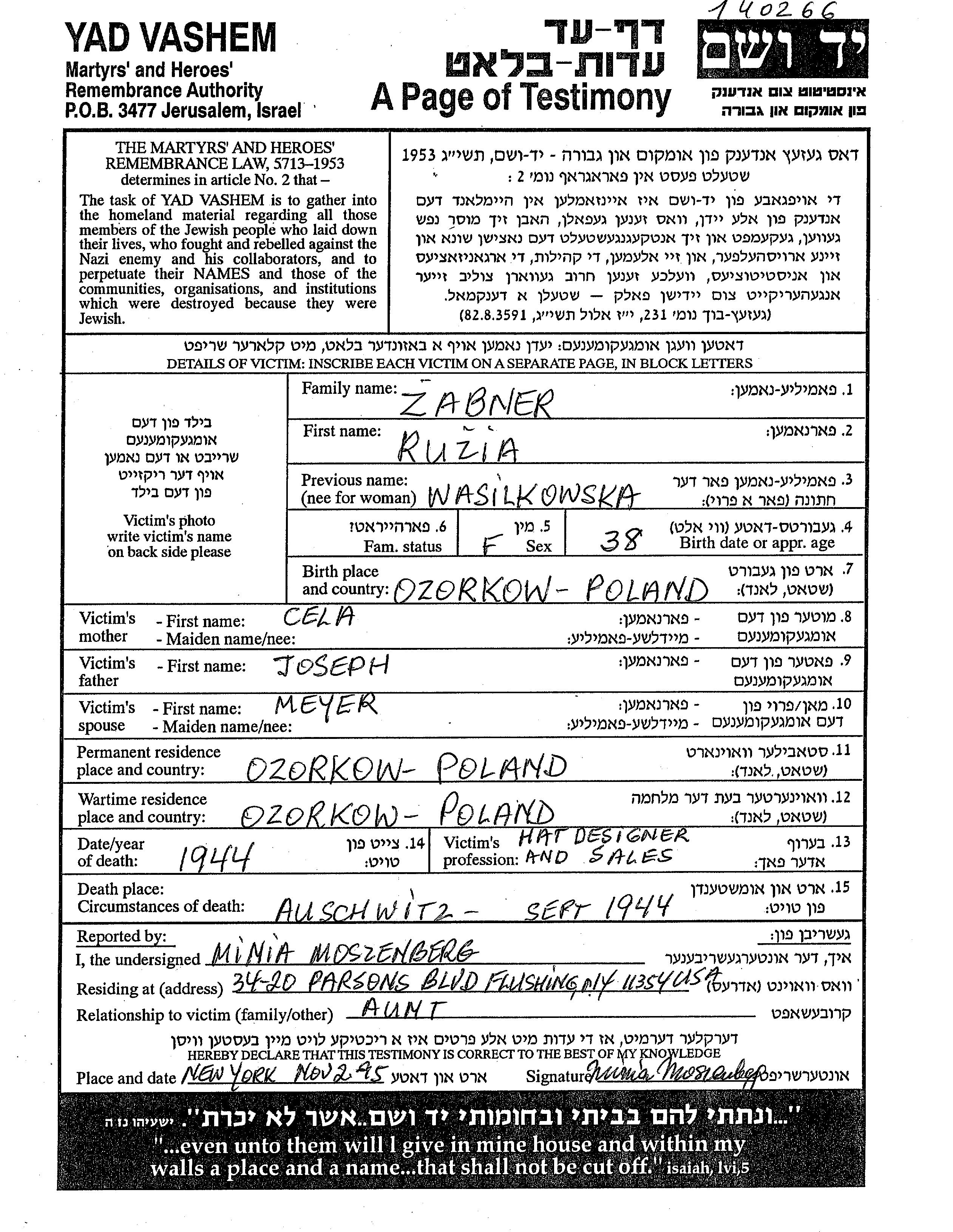 Ruzia זבנר לבית Wasilkowski נולדה בOzorkow שבפולין בשנת 1906 ליוסף וCela. היא היתה כובענית ונשואה לMeyer. לפני מלחמת העולם השניה התגוררה בOzorkow שבפולין. בזמן המלחמה היא היתה בOzorkow שבפולין.