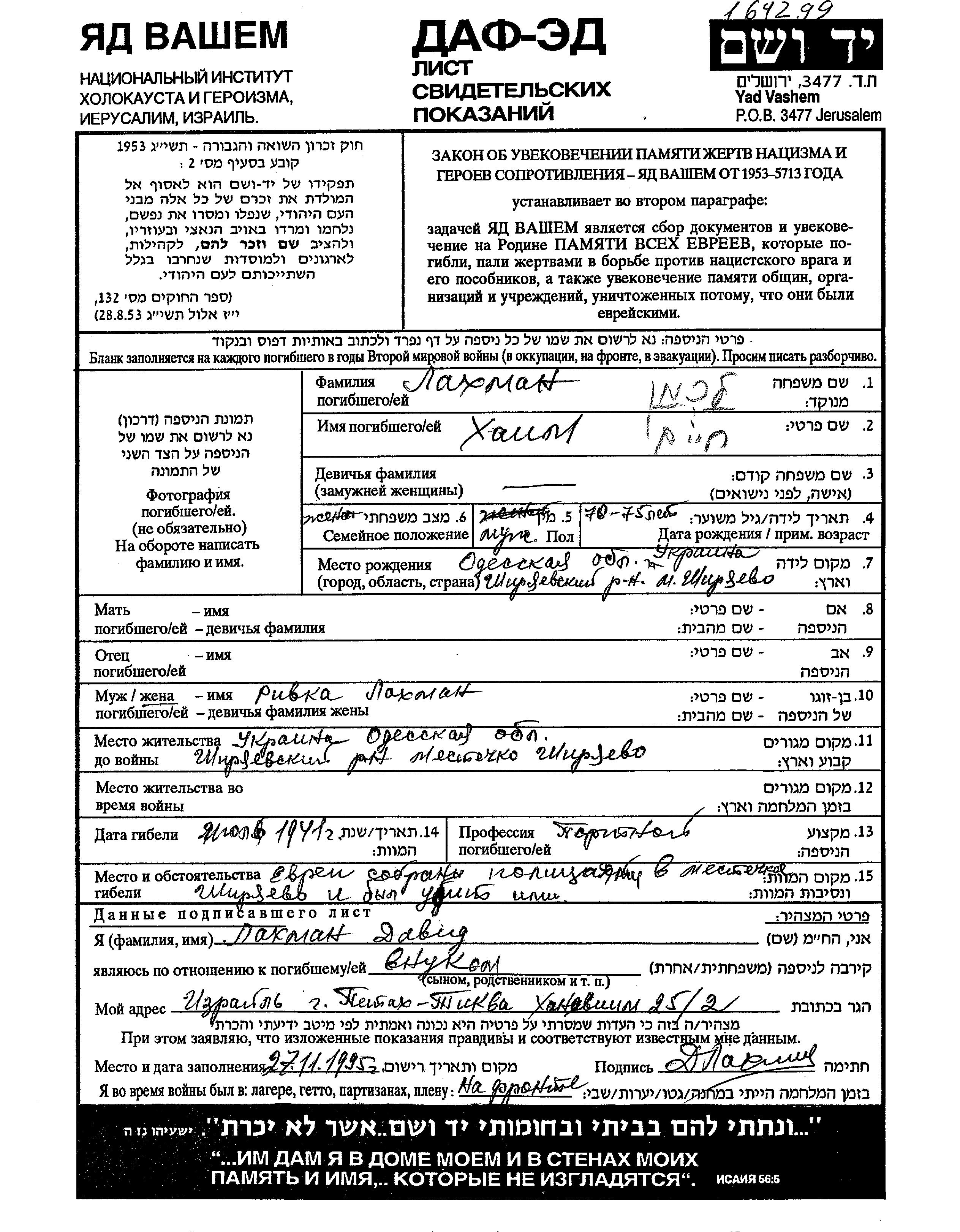 חיים נרצח בשואה. מקום המוות: Shiryayevo שבאוקראינה (ברה"מ) בשנת 1941.
