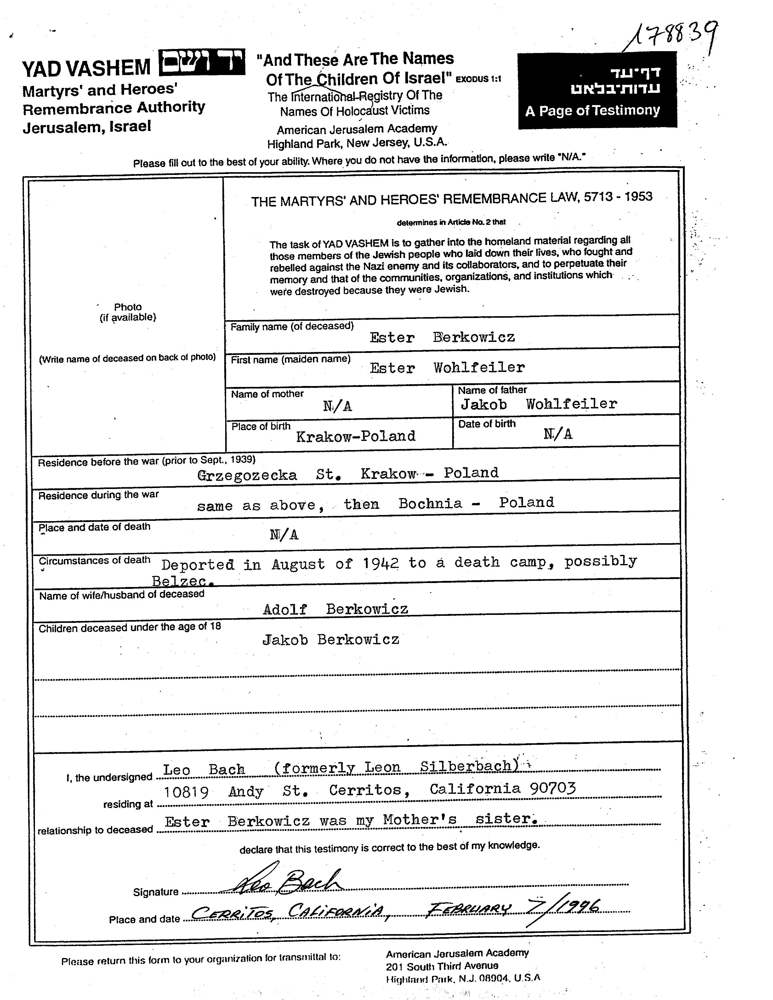 אסתר Berkowicz לבית Wohlfeiler נולדה בKrakow שבפולין לJakob. היא היתה נשואה לאדולף. לפני מלחמת העולם השניה התגוררה בKrakow שבפולין. בזמן המלחמה היא היתה בBochnia שבפולין.