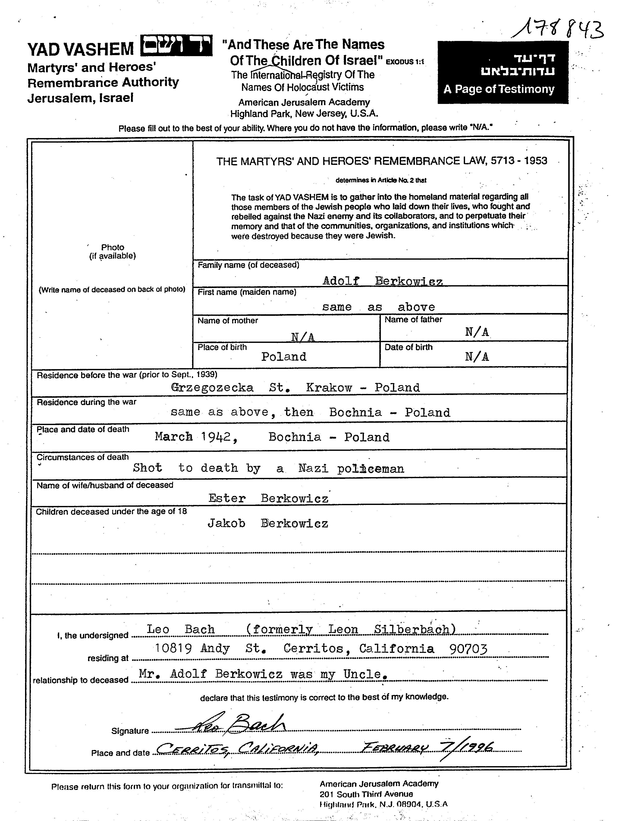 אדולף Berkowicz נולד בפולין שבפולין. הוא היה נשוי לאסתר. לפני מלחמת העולם השניה התגורר בKrakow שבפולין. בזמן המלחמה הוא היה בBochnia שבפולין. אדולף נרצח בשואה. מקום המוות: Bochnia שבפולין בשנת 1942.