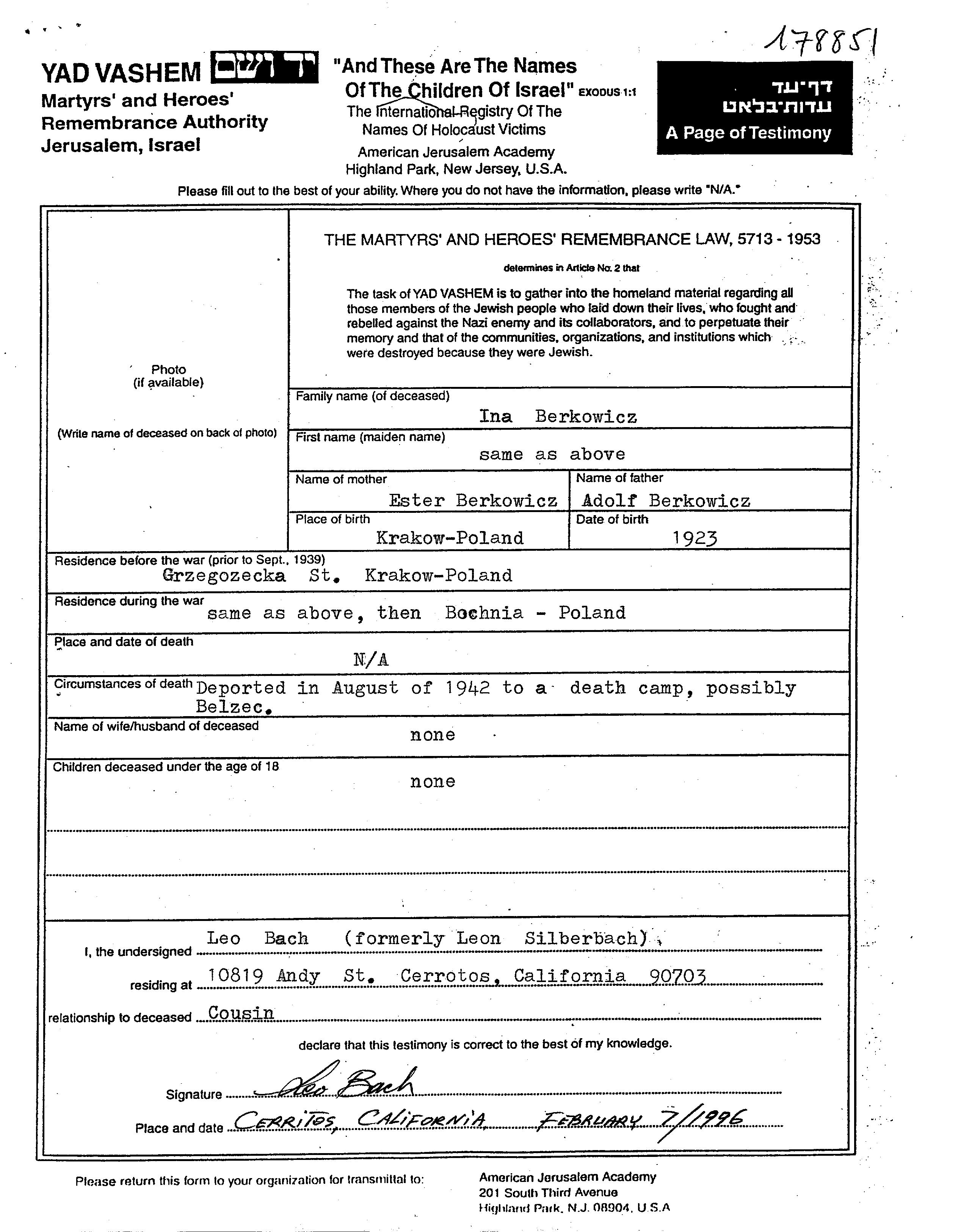 אינה Berkowicz נולדה בKrakow שבפולין בשנת 1923 לאדולף ואסתר. היא היתה רווקה. לפני מלחמת העולם השניה התגוררה בKrakow שבפולין. בזמן המלחמה היא היתה בBochnia שבפולין. אינה נרצחה בשואה. מקום המוות: Belzec שבפולין בשנת 1942.