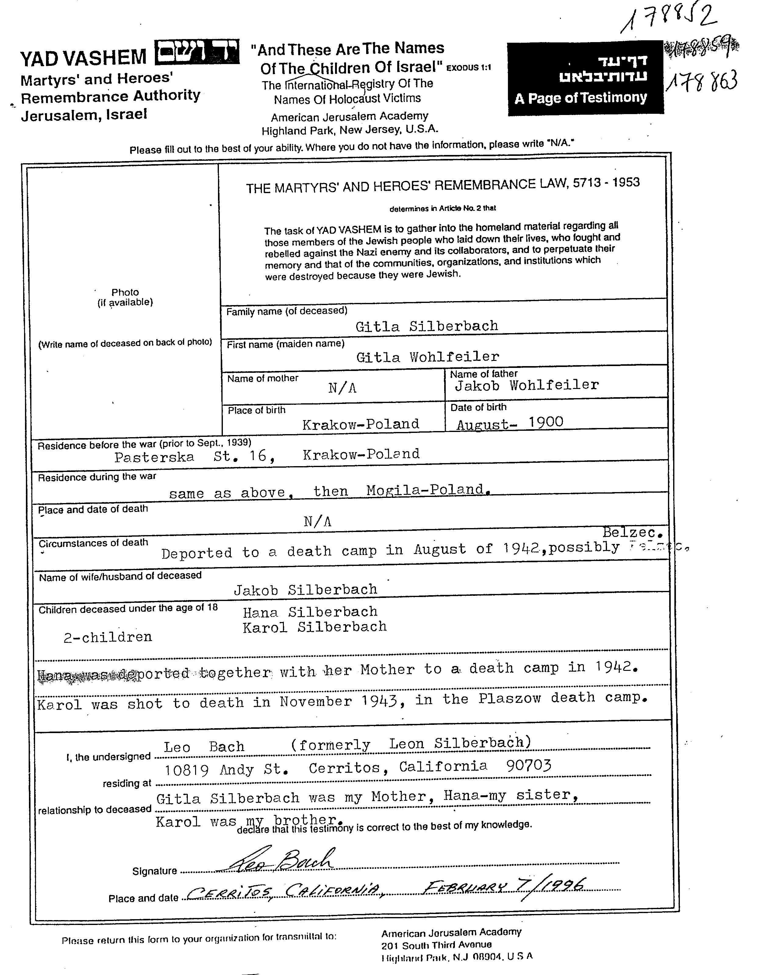Gitla Silberbach לבית Wohlfeiler נולדה בKrakow שבפולין בשנת 1900 לJakob. היא היתה נשואה לJakob. לפני מלחמת העולם השניה התגוררה בKrakow שבפולין. בזמן המלחמה היא היתה בMogila שבפולין.