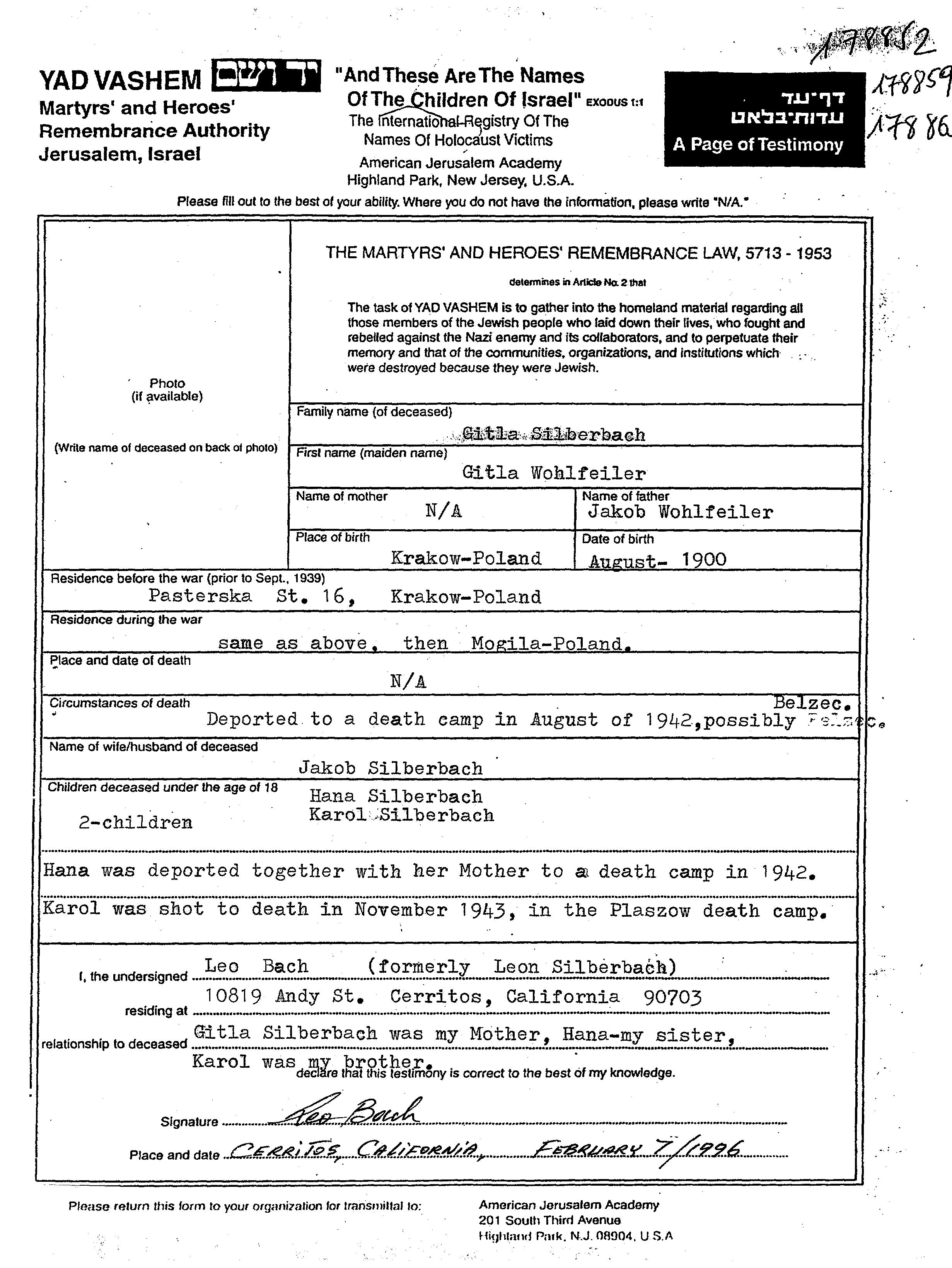 הנה Silberbach נולדה בפולין שבפולין לJakob וGitla לבית Wohlfeiler. היא היתה ילדה. לפני מלחמת העולם השניה התגוררה בKrakow שבפולין. בזמן המלחמה היא היתה בMogila שבפולין. הנה נרצחה בשואה. מקום המוות: Belzec שבפולין בשנת 1942.