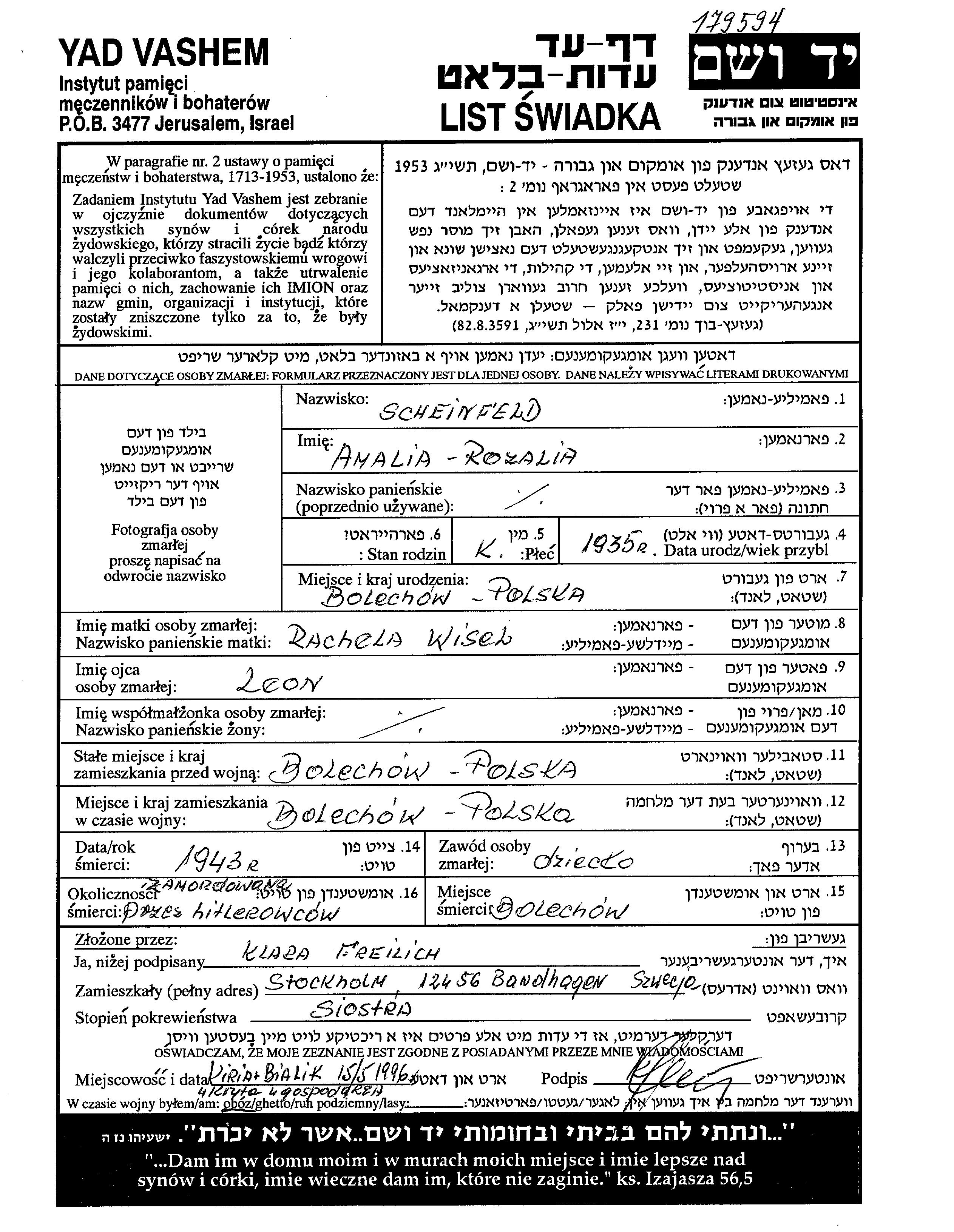רוזליה אמליה Scheinfeld נולדה בBolechow שבפולין בשנת 1935 ללאון וRachela לבית Wisel. היא היתה ילדה. לפני מלחמת העולם השניה התגוררה בBolechow שבפולין. בזמן המלחמה היא היתה בBolechow שבפולין.